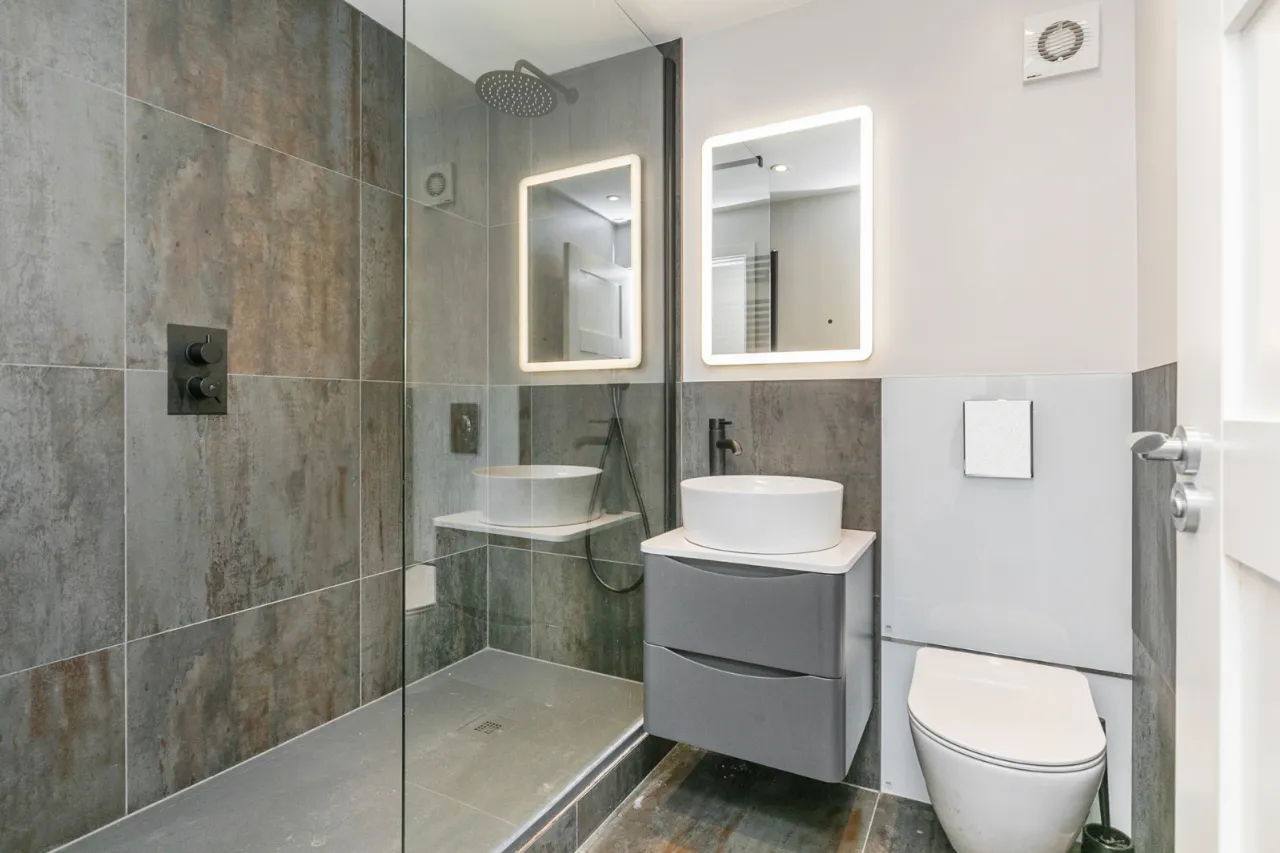 Low flush WC, twin wash hand basins with chrome mixer tap, large walk in shower with chrome thermostatic shower unit, chrome heated towel rail, extractor fan, ceramic tiled floor, part tiled walls..