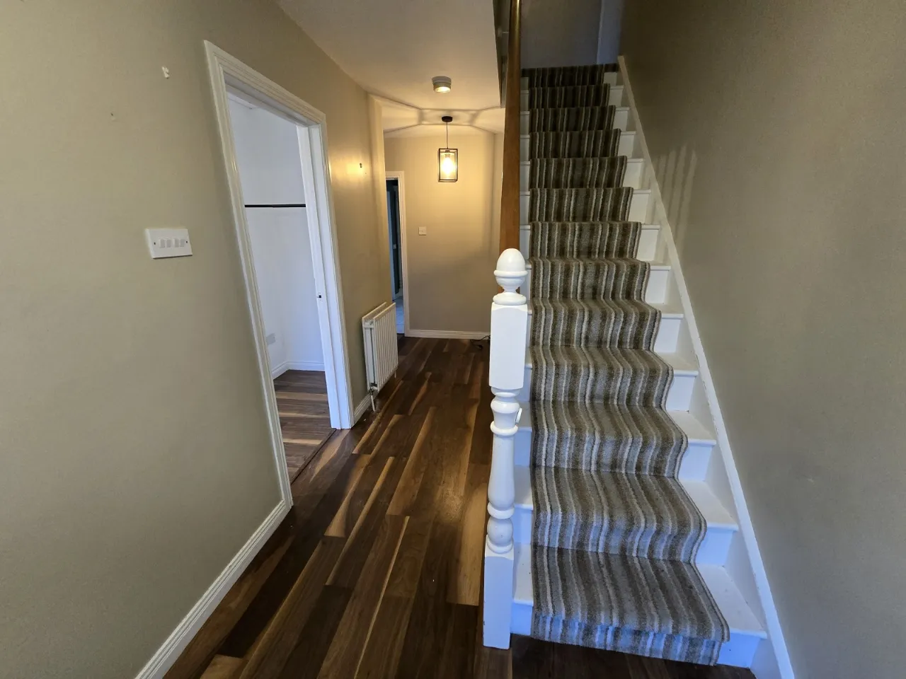 Wooden Floor, Composite front door, Radiator, Wooden stair case with carpet runner.