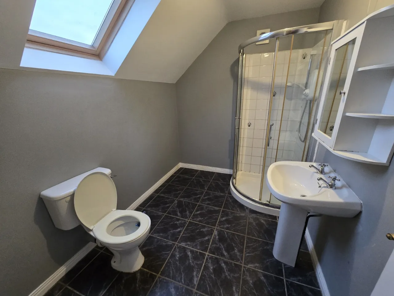 Tiled floor, Shower with tiled surround, Toilet, Sink
