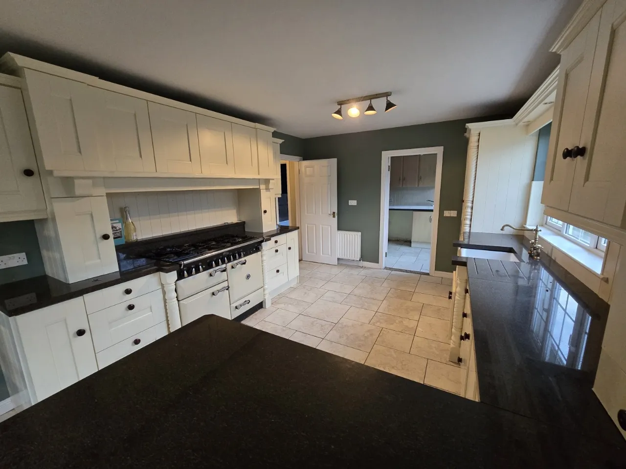 Tiled floor, Rangemaster aga, High and low level storage units, Fire clay Belfast sink, Marble worktop, Extractor fan, Integrated Fridge Freezer.