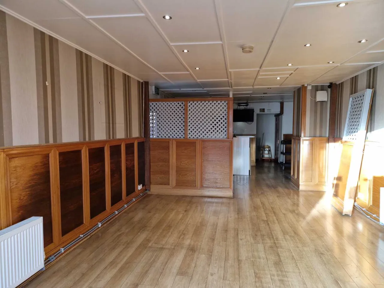 Laminate floor, recessed lights, wood panelling, two entrance/ exit doorways.