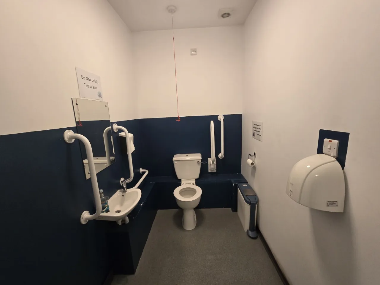 Diabled toilet, sink, Assistance Rails, emergency pull cord, hand dryer.