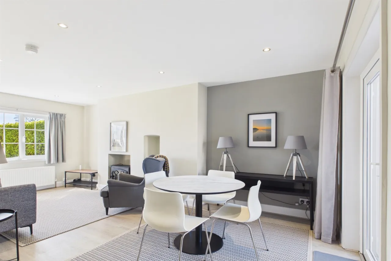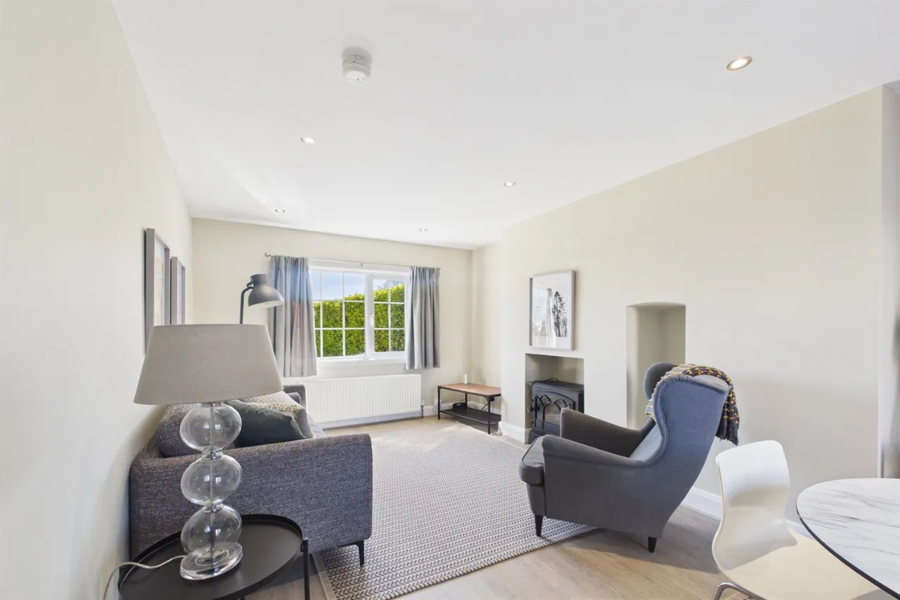 The accommodation comprises a bright and spacious living area, a fitted kitchen with ample storage and integrated appliances, including a dishwasher, and two generously sized bedrooms. In addition, the property benefits from a separate study, providing an ideal space for home working or additional storage.