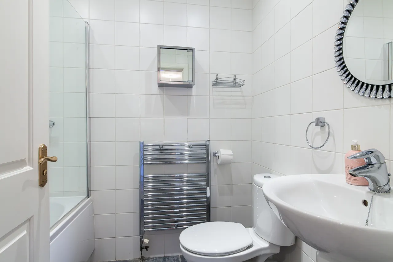 Comprises of paneled bath with overhead shower and shower screen, ceramic bowl sink unit with mixer tap, low flush WC, chrome heated towel rail, tiled walls and floor. Recessed lighting and extractor fan.