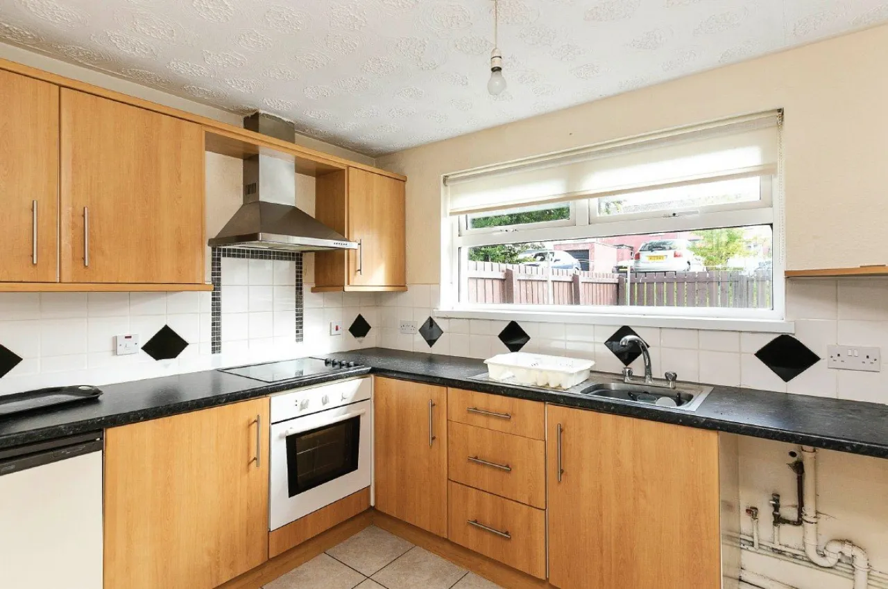 Range of high and low level units. Single drainer sink unit with mixer tap. Four ring ceramic hob with under oven and extractor over. Plumbed for washing machine. Space for fridge freezer. Gas fired boiler.