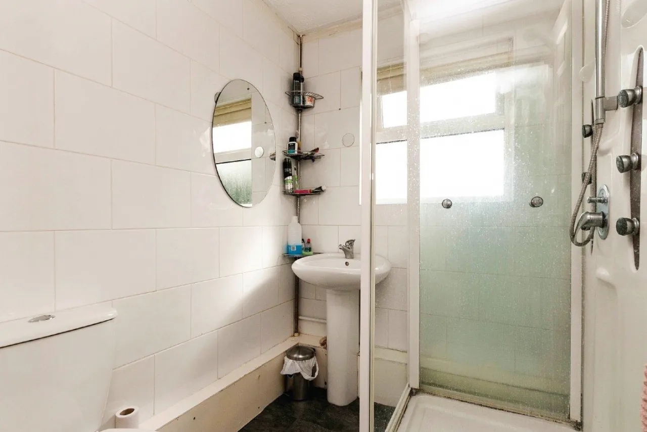 Shower cubicle. Low flush WC. Pedestal wash hand basin. Fully tiled walls.