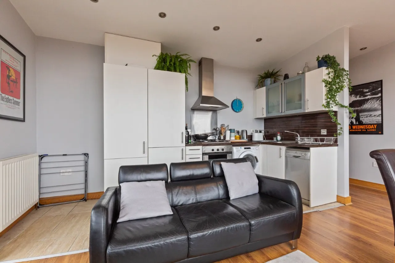 Contemporary fitted kitchen with excellent range of units, work surfaces, stainless steel sink unit and mixer tap, integrated oven with four ring gas hob and extractor fan, plumbed for washing machine and dishwasher, integrated fridge freezer. Tiling to kitchen area, wood effect flooring to living room. Access to balcony.