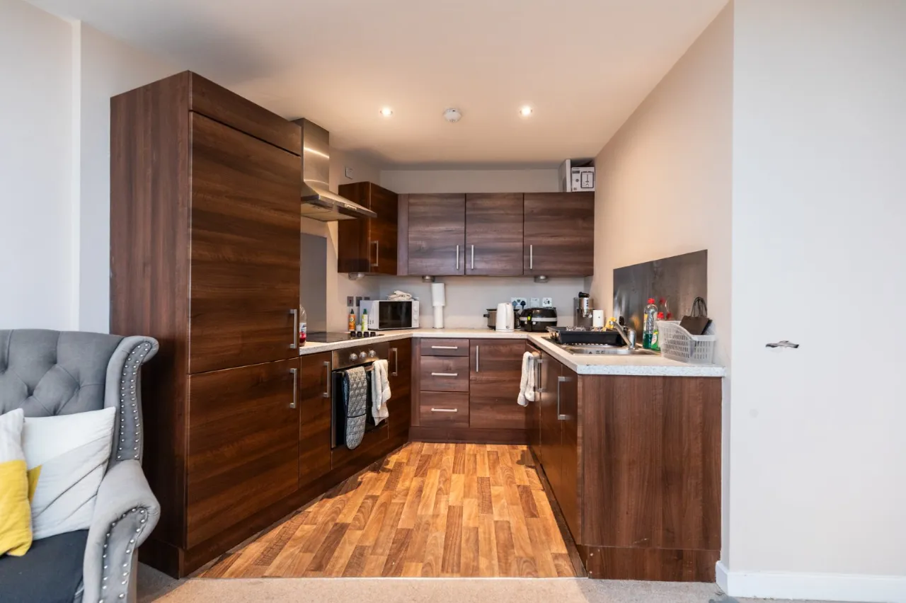 LIVING/KITCHEN/ DINING AREA: 23'7" x 17'1" (7.2m x 5.2m) Spacious living/kitchen area, with spectacular views over Belfast City. This well-presented room is finished with carpet floors in the living room and tiled flooring in the kitchen area.