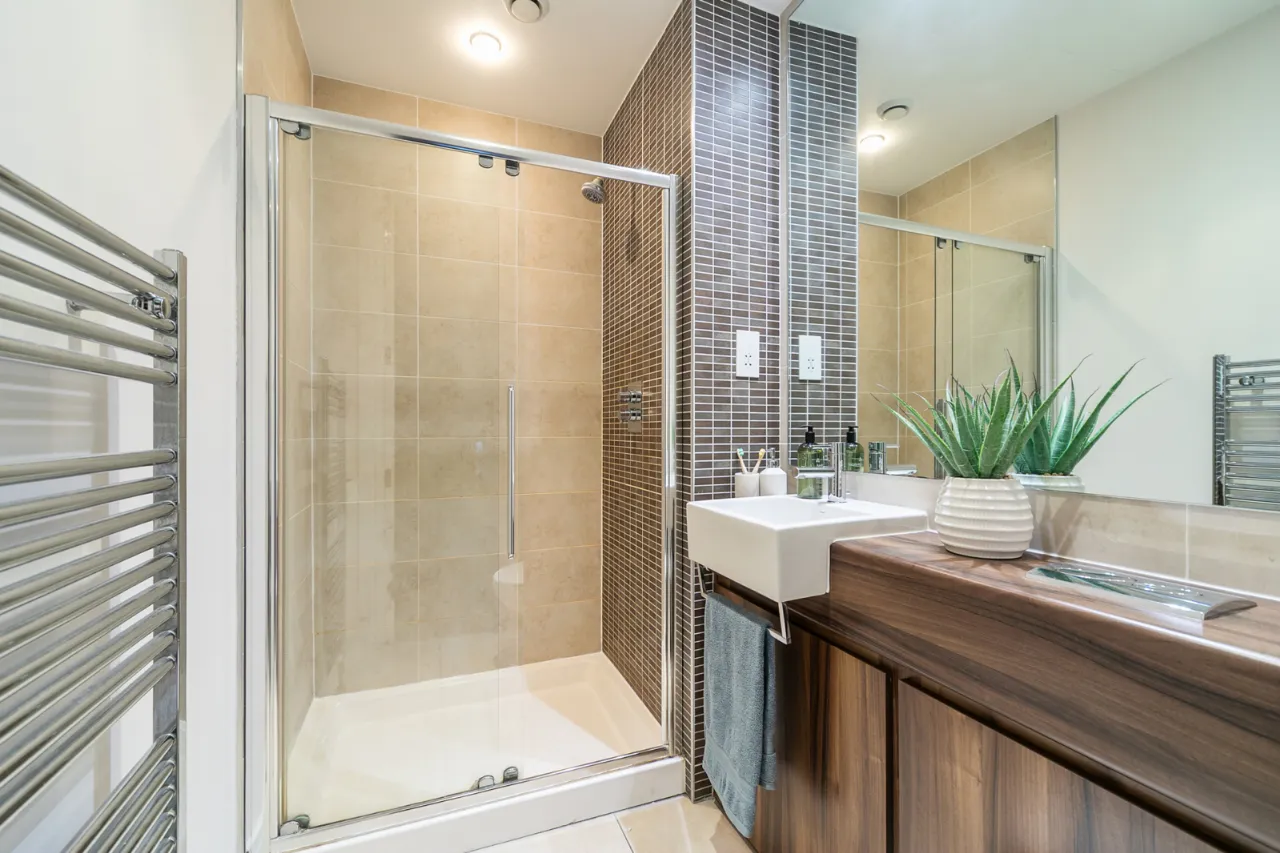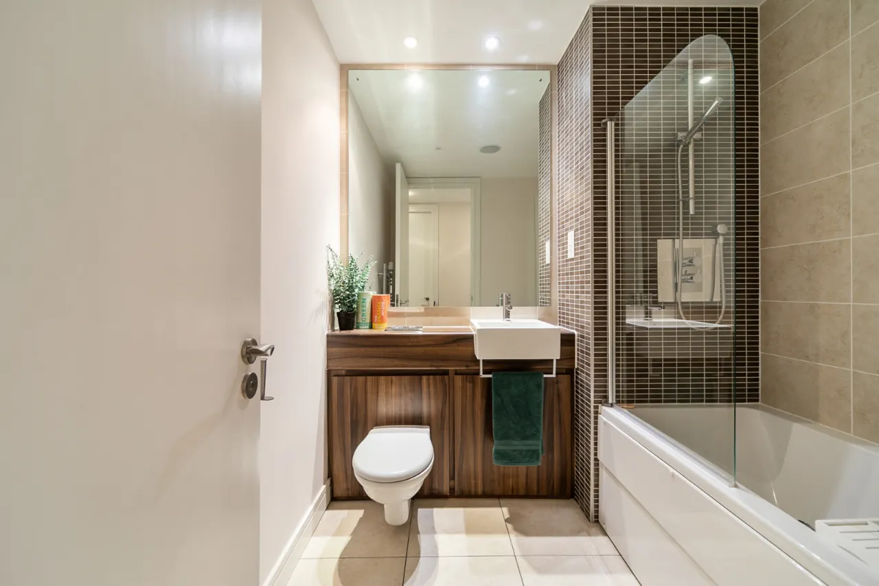 White suite comprising, low flush WC, floating wash hand basin with chrome mixer tap and built in vanity unit, push button panelled bath with fixed glass door, shower with chrome thermostatic control valve and telephone attachment, part tiled walls, tiled floor, chrome heated towel rail