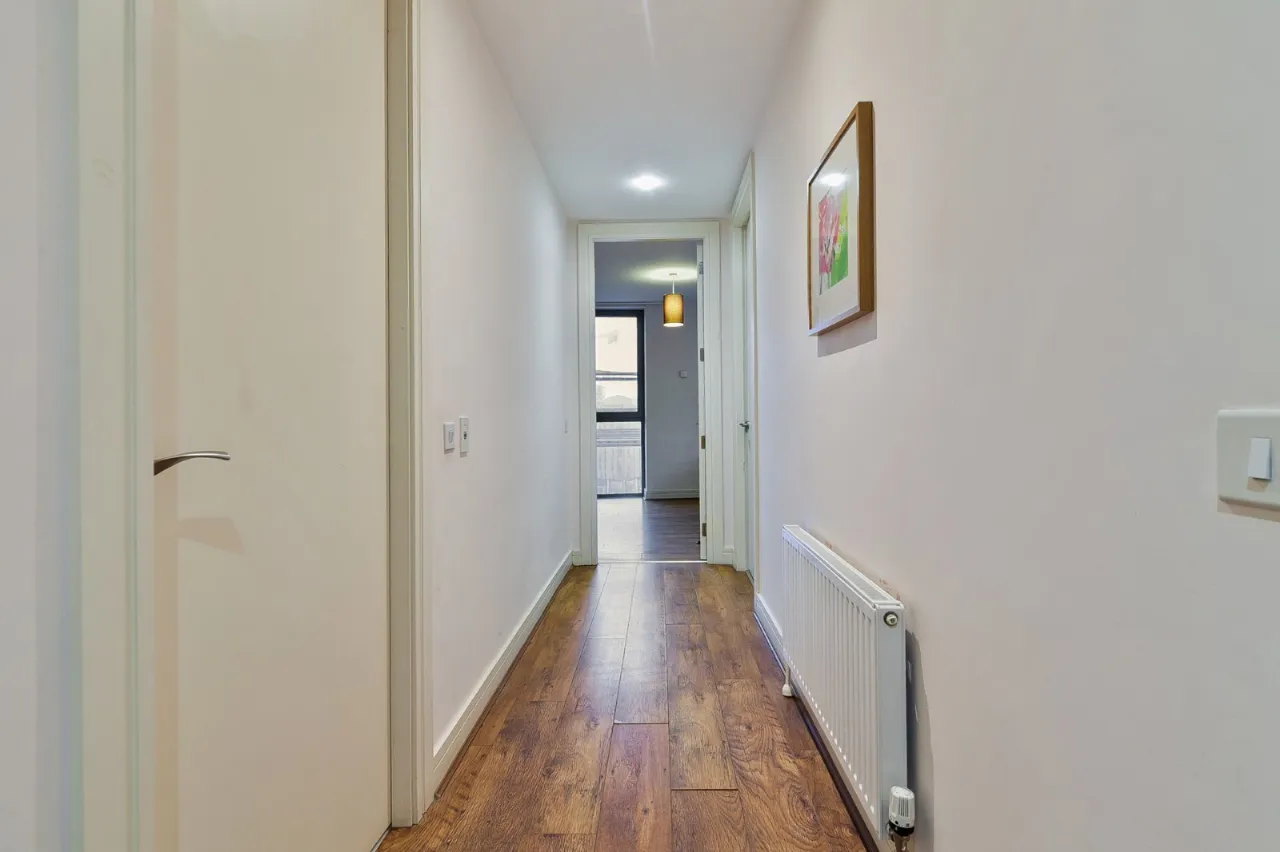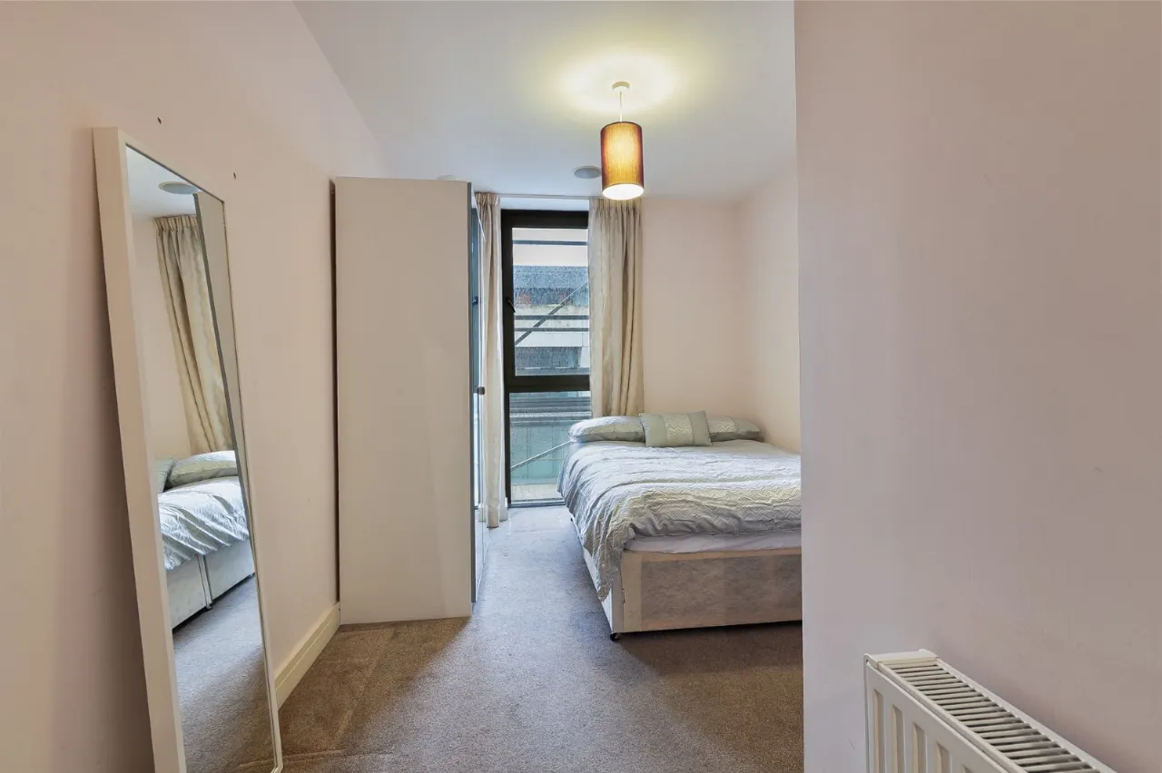 Open plan kitchen / living with laminate flooring meeting the tile floored kitchen. The room has neutral décor and provides outdoor space in the form of a balcony looking over the famous Titanic shipyard. The kitchen itself is fully fitted with units high and low, built in fridge freezer, dishwasher, oven and 4 ring gas hob and microwave. Sliding door to walk out balcony.