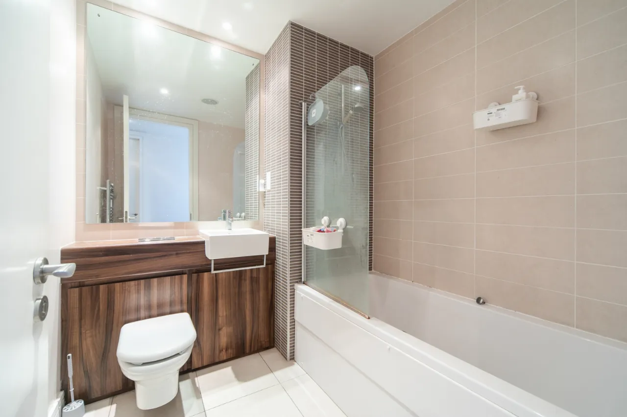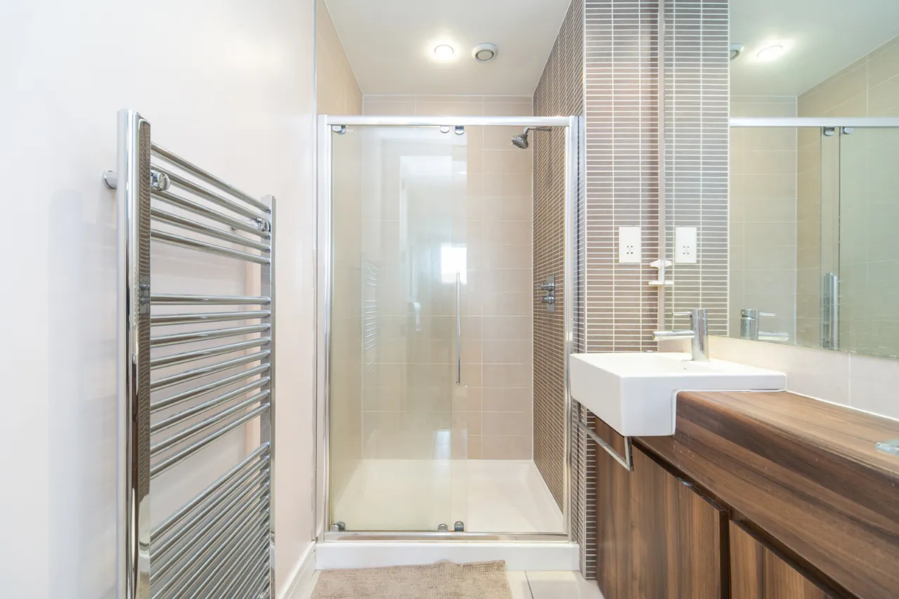White suite comprising, low flush WC, floating wash hand basin with chrome mixer tap and built in vanity unit, push button panelled bath with fixed glass door, shower with chrome thermostatic control valve and telephone attachment, part tiled walls, tiled floor, chrome heated towel rail