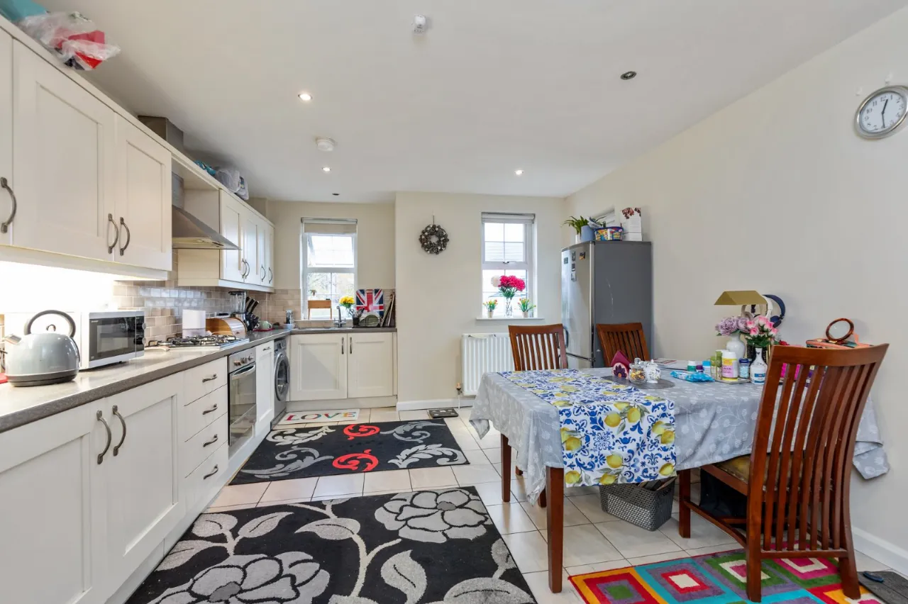The property comprises a large living area featuring a beautiful bay window, creating a light-filled space perfect for relaxation and entertaining. An adjoining kitchen includes a range of integrated appliances and ample storage, while the formal dining area offers direct access to a private balcony ideal for morning coffee or evening dining.