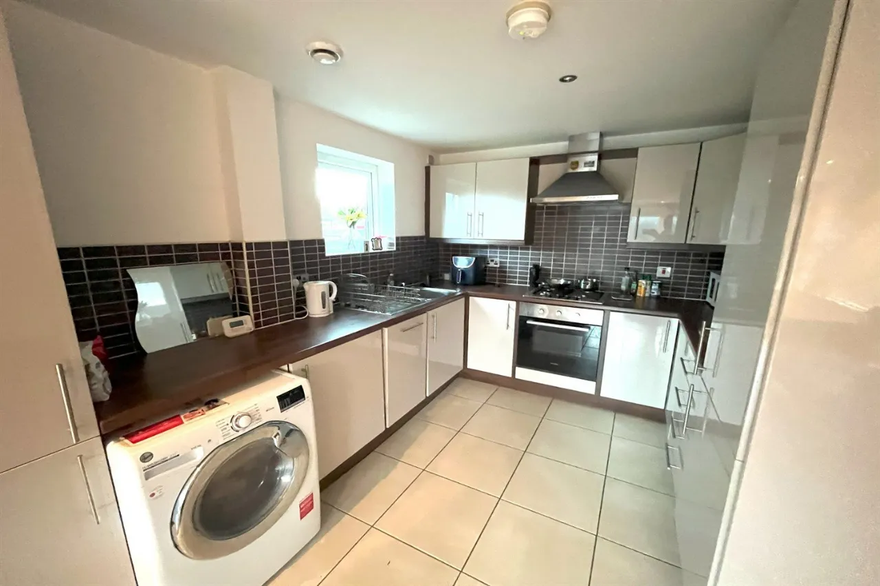 Ceramic tiled floor, partially tiled walls, 1 1/2 bowl stainless steel sink unit with mixer tap, range of high and low level white high gloss units, integrated electric oven, 4 ring gas hob, stainless steel extractor over, fridge freezer, dishwasher, plumber for washing machine.