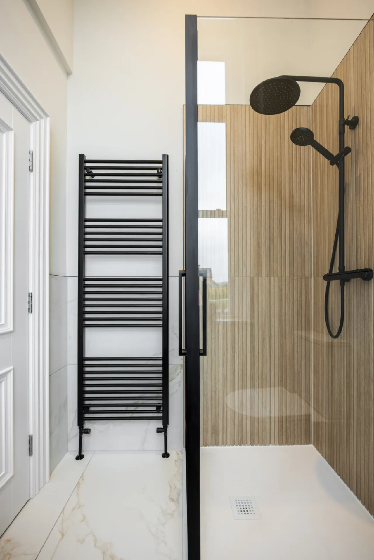 White Vanity Unit, Black Trim Shower, Matt Black Heated Towel Rail, Regen Floor and Wall Tiles and Senia Wall Tiles within Shower.