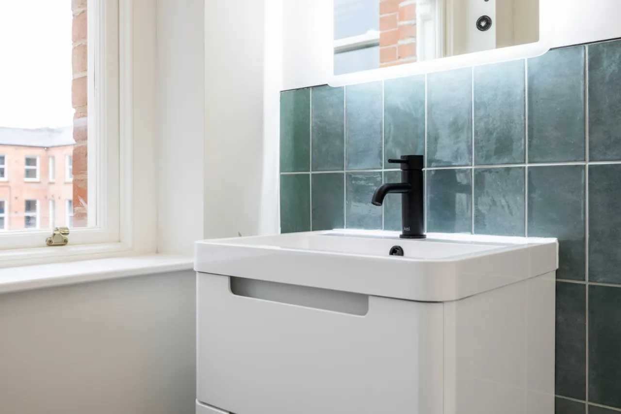 White Vanity Unit, Black Trim Shower and Tap, Matt Black Heated Towel Rail, Chriwic Green Wall Tile