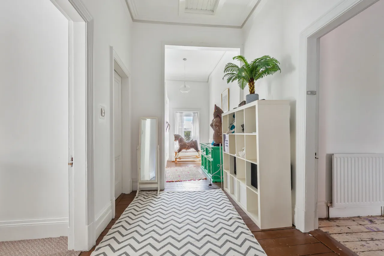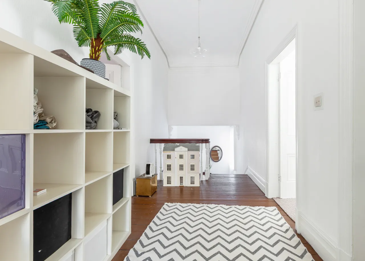 Wooden floor, under stair storage and corniced ceiling.