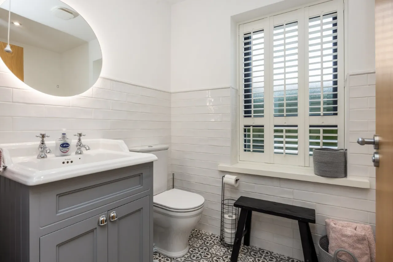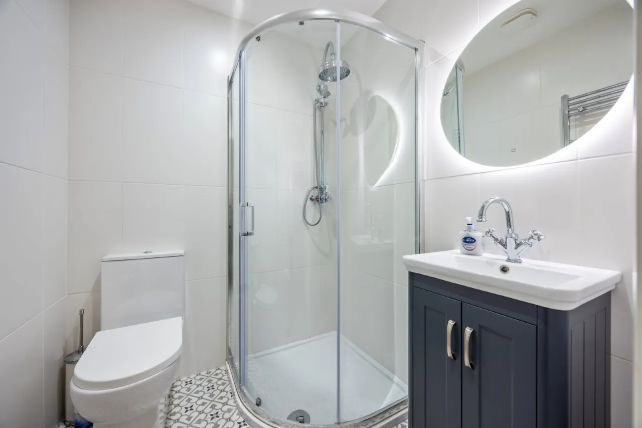 Flair Verve shower cubicle with Aqualla Georgia thermos drench shower, Westminster vanity sink unit with Cal Palma chrome swivel spout tap, Hib Theme steam free LED mirror, Lansdown close coupled WC with soft close seat and heated chrome towel rail/radiator.