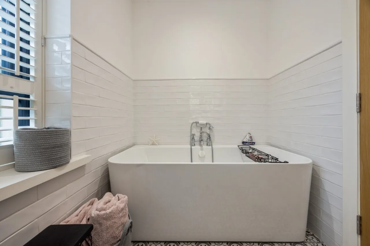Free standing Waters Rivers bath, complete with chrome Georgia mixer taps, low flush WC, Burlington vanity sinks unit and heated chrome towel rail/radiator.