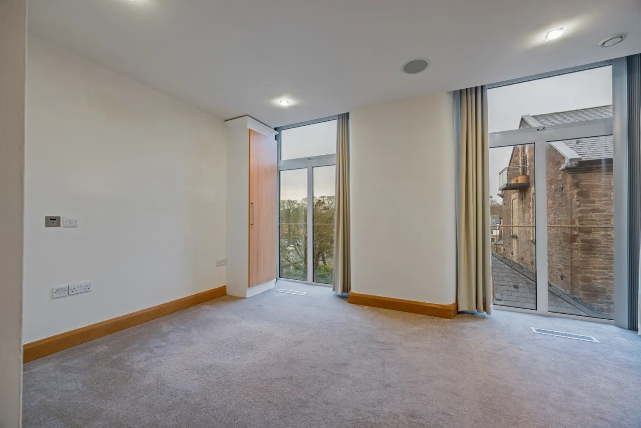 Excellent range of modern built in robes with lighting, concealed Worcester gas boiler, ceiling speakers, recessed spotlighting, two floor to ceiling windows.