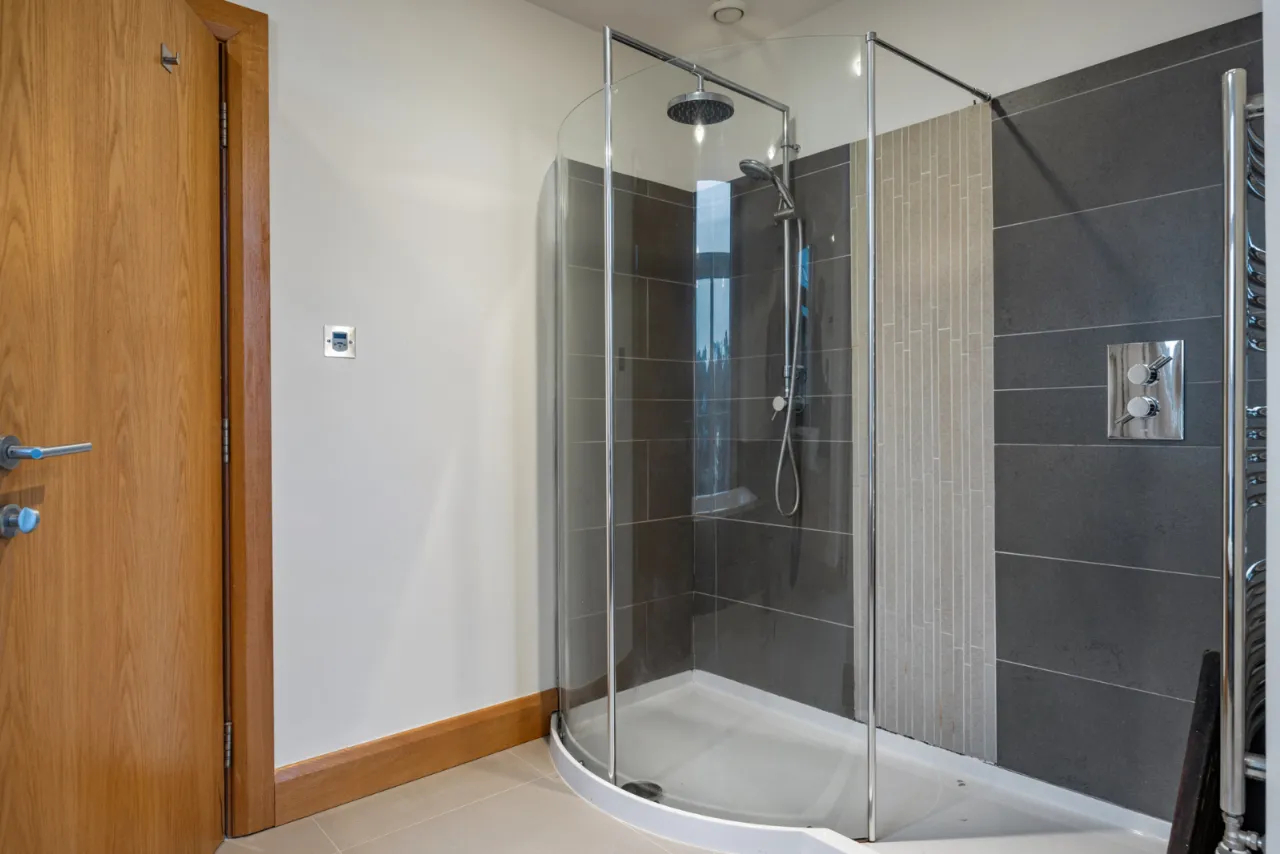 Modern Villeroy and Boch white suite comprising: Large separate fully tiled shower cubicle, glass panel, floating vanity sink unit with mixer taps, push button WC with concealed cistern, wall tiling, chrome towel radiator, recessed spotlighting, extractor fan, shaver point.
