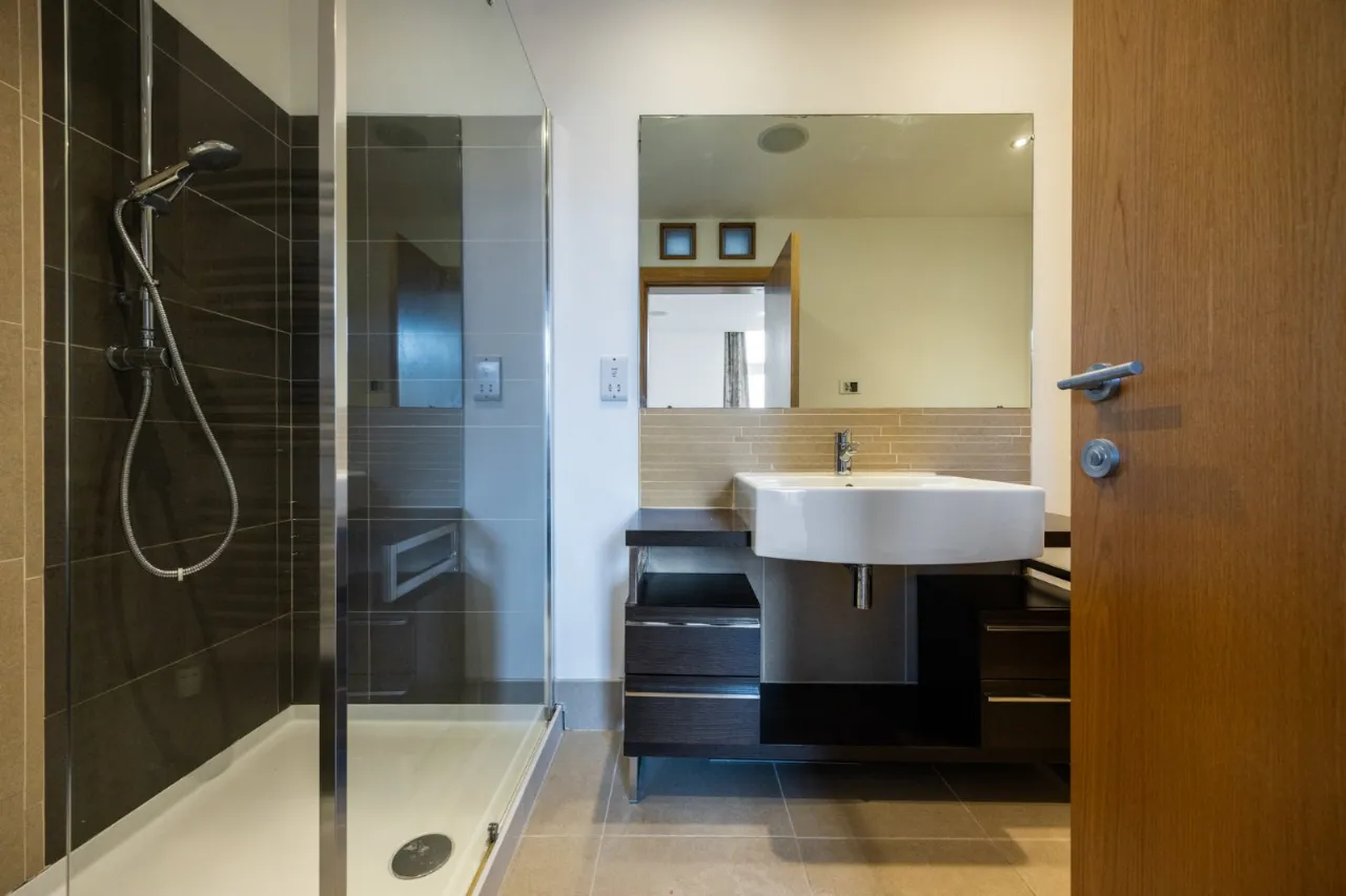 Modern white Villeroy and Boch suite comprising: Large separate fully tiled shower cubicle with thermostatically controlled shower, floating vanity unit with white wash hand basin with mixer taps, push button WC (concealed cistern), chrome towel radiator, recessed spotlighting, full height Westerly facing window, shaver point.