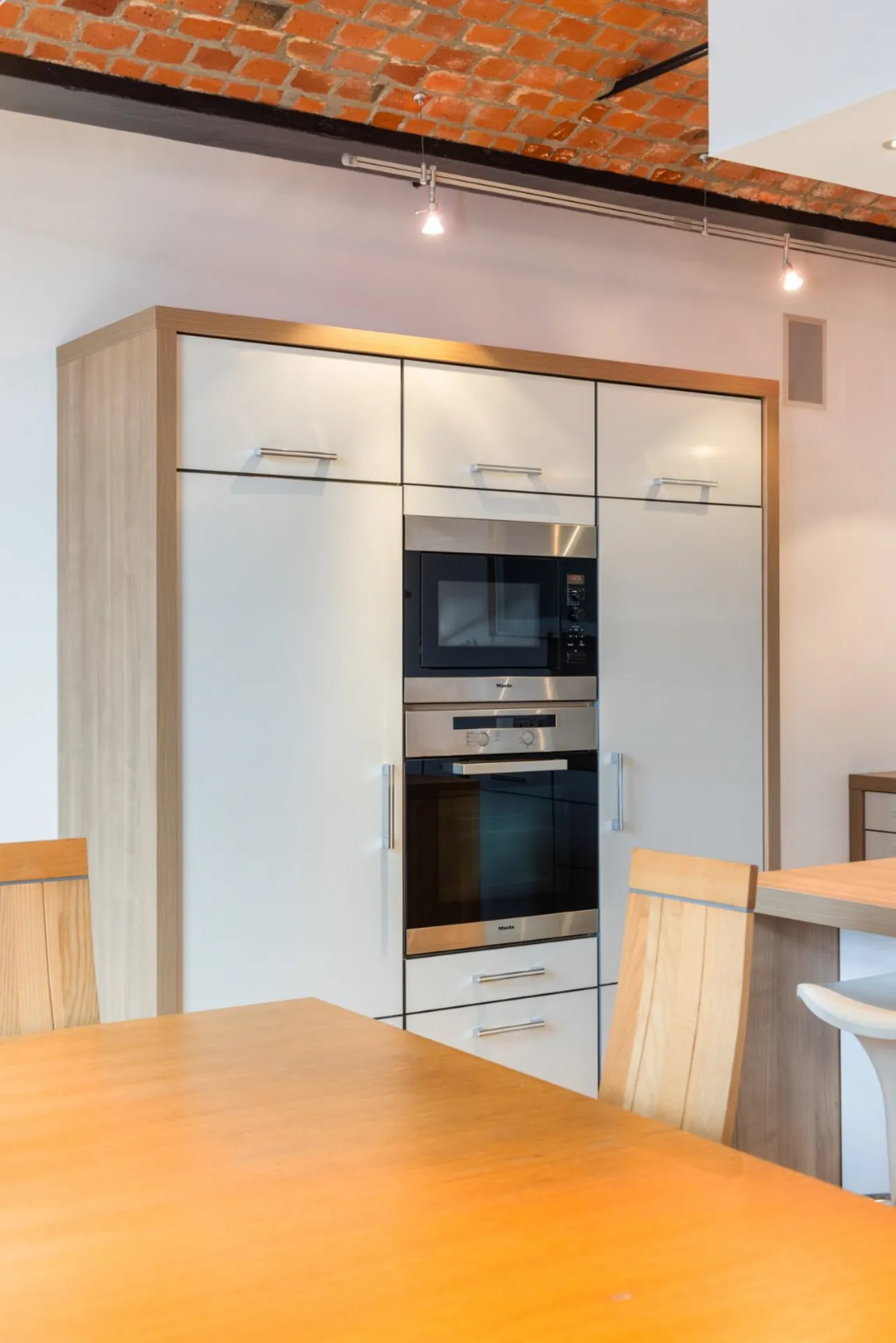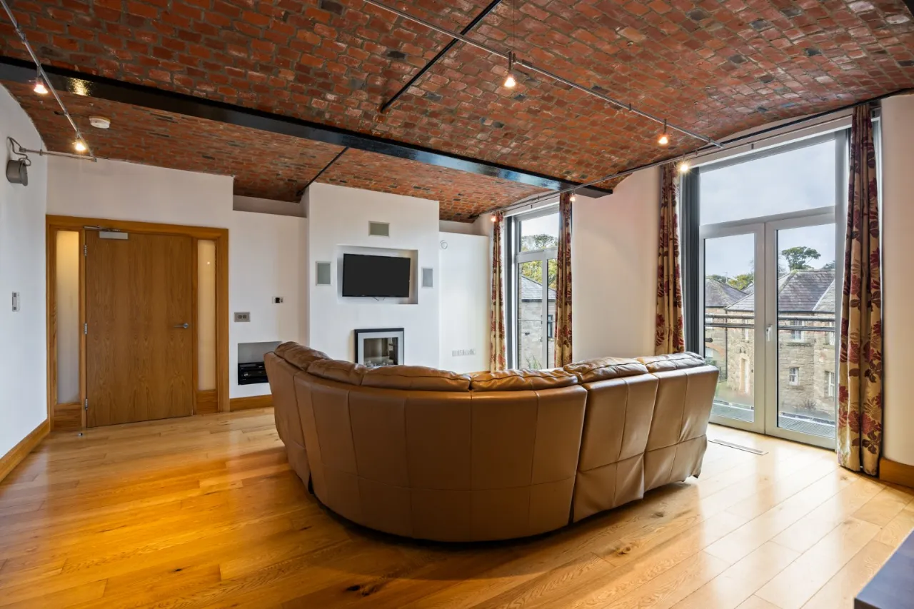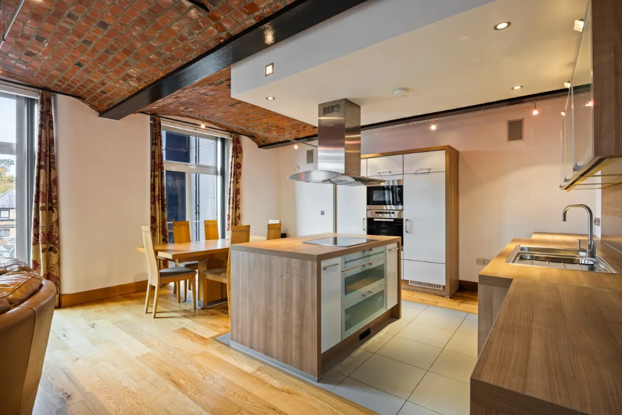 Franke 1.5 tub single drainer stainless steel sink unit with mixer taps, excellent range of high and low level modern units with oak effect Formica roll edge work surfaces, integrated fridge and freezer, oven and dishwasher, microwave (all Miele), integrated washing machine, island with matching units and worktops, glazed pot drawers, Miele induction hob, Neff stainless steel extractor hood, 2 pull out larder drawers and breakfast bar, ceramic tiled floor, polished oak floor, modern lighting scheme, feature wall mounted inset electric fire, recess for wall mounted TV, surround sound system with Panasonic amp, Jamo subwoofer and integral surround sound wall speakers, feature Belfast Brick barrel ceiling, 3 full height Westerly facing windows, French doors to Balcony.