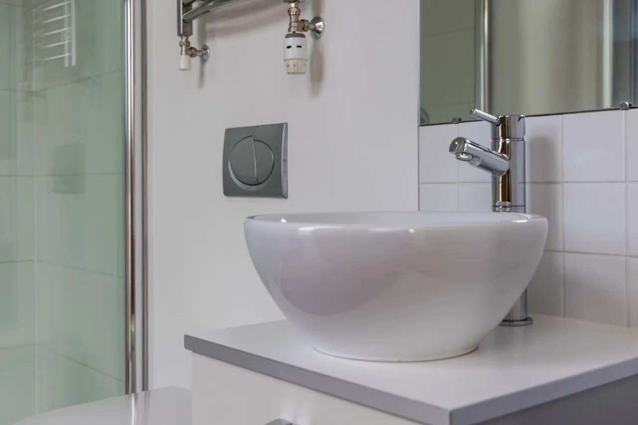 Modern white Villeroy and Boch suite comprising: wall mounted wash hand basin with mixer taps, push button WC (concealed cistern), polished oak floor, recessed spotlighting.