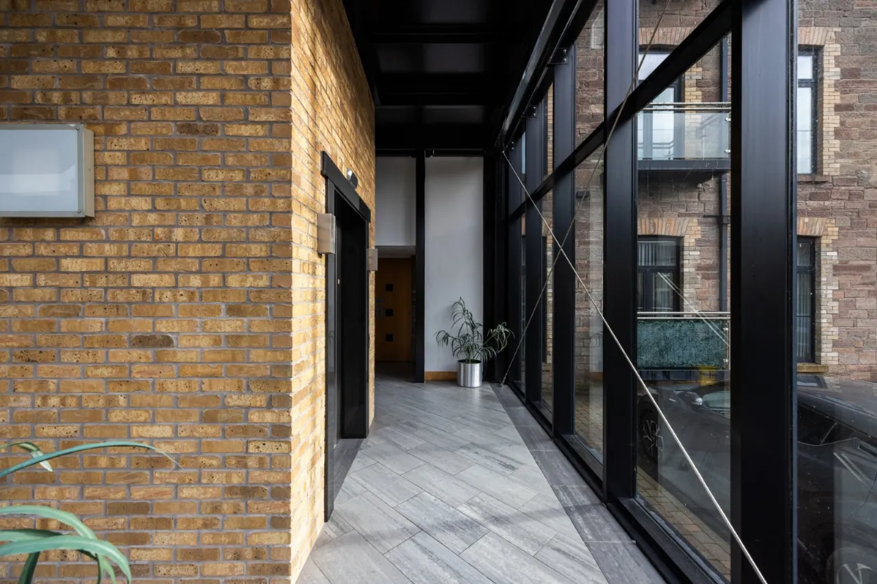 Ceramic tiled floor, recessed spotlighting on sensors leading to solid oak front door with frosted glass sidelights to Apartment 8.