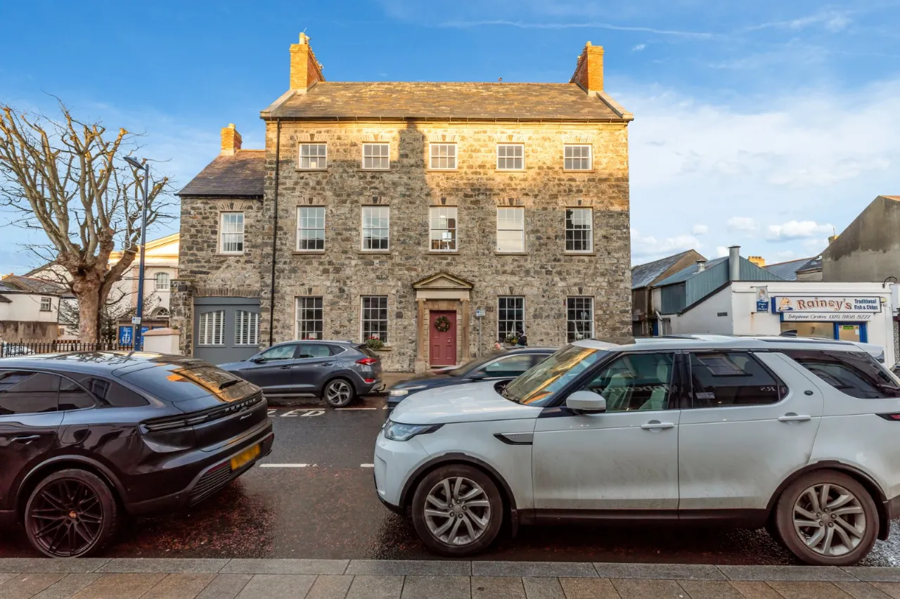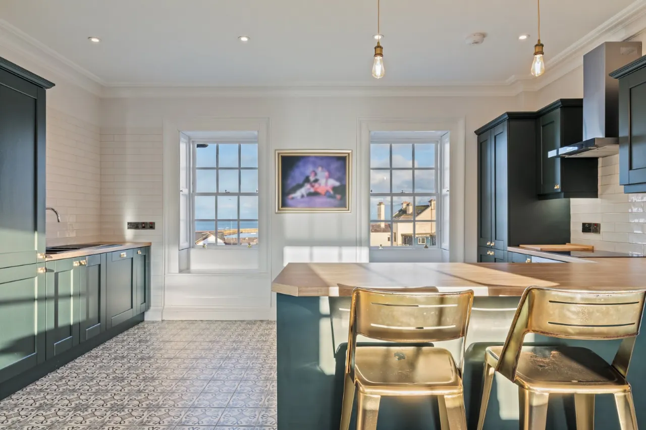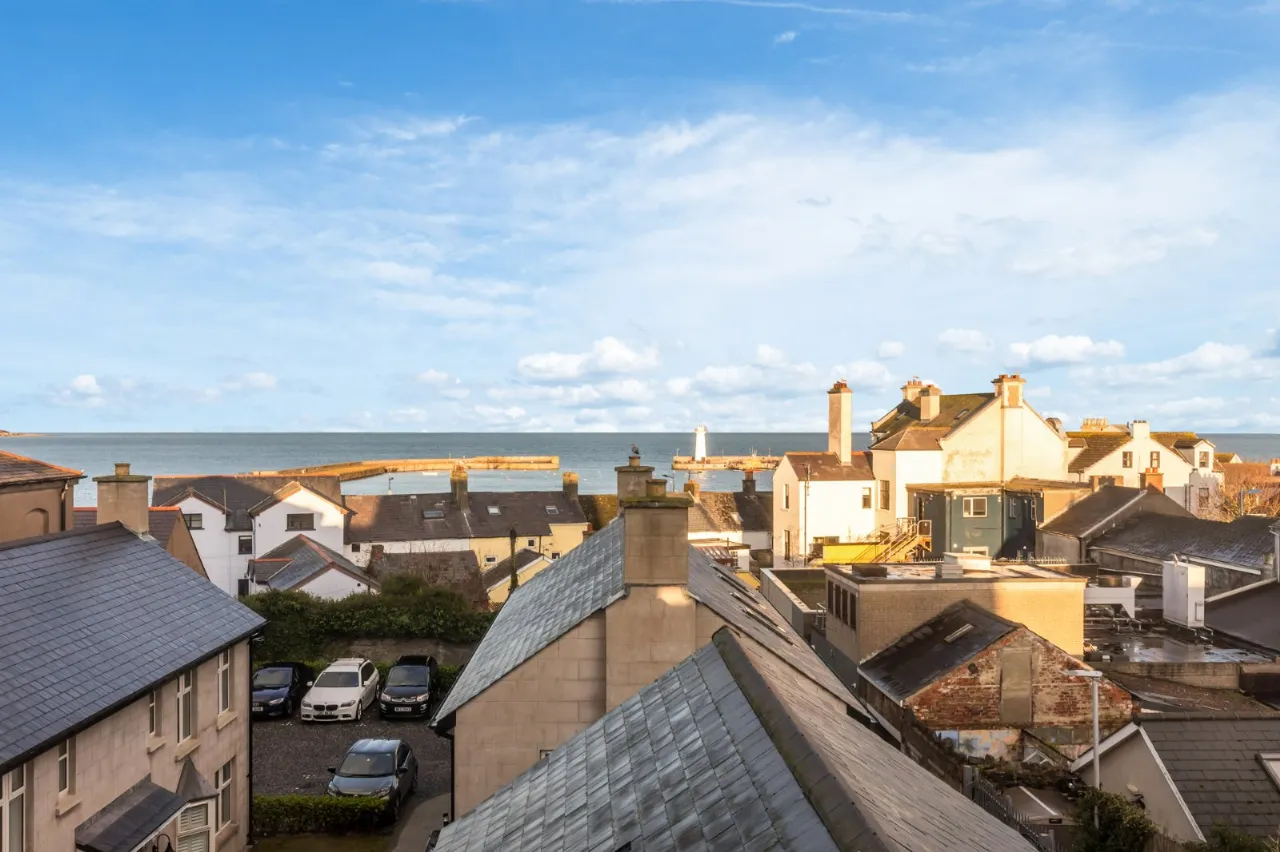 Black Rangemaster 1.5 tub single drainer sink unit with mixer taps, excellent range of high and low level dark green shaker style units, brass effect hardware, 4 ring ceramic hob unit, built in oven, stainless steel extractor hood, integrated fridge freezer, dishwasher and washer dryer, broom cupboard, concealed Worcester Bosch gas boiler, wall tiling, feature period style floor to Kitchen/Dining area, breakfast bar, dual aspect with stunning views over Donaghadee, the Lighthouse and the Irish Sea. Feature mock fireplace with slate hearth, corniced ceiling, ceiling rose, picture rail, wall light points, feature timber window surrounds, LED recessed spotlighting.