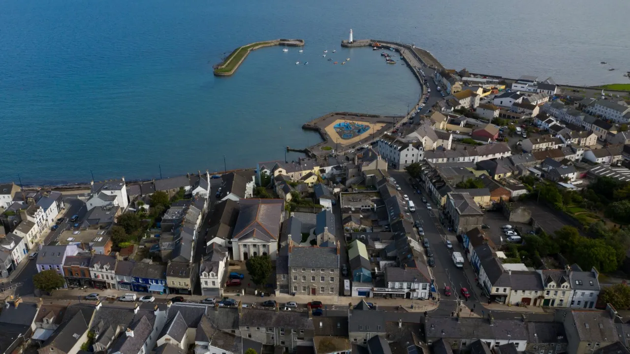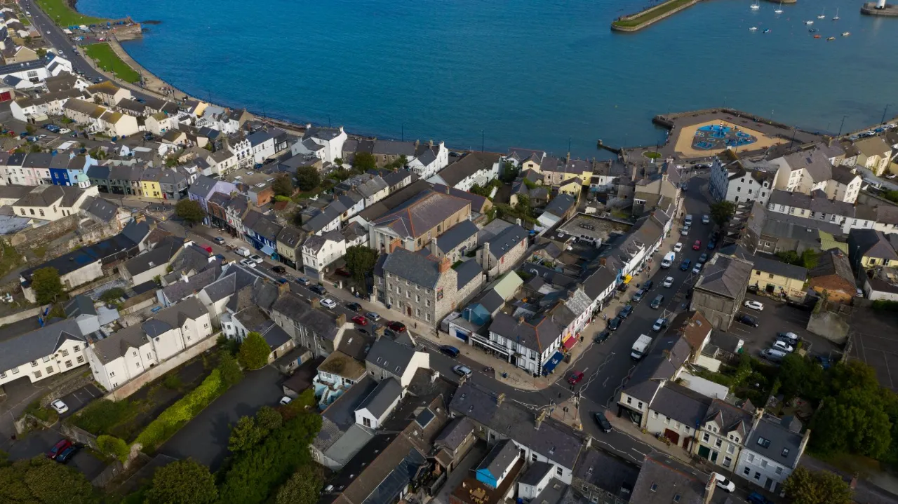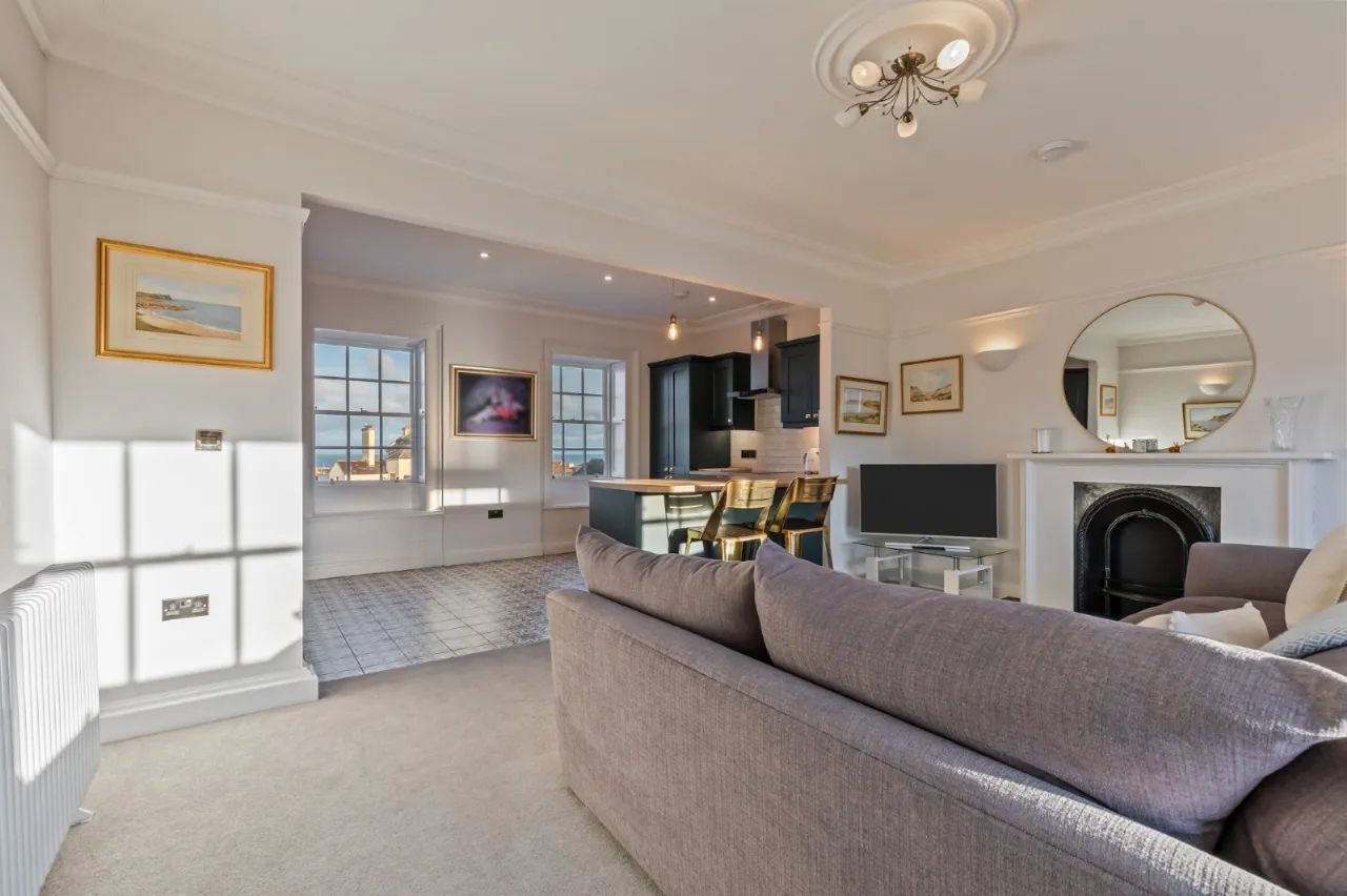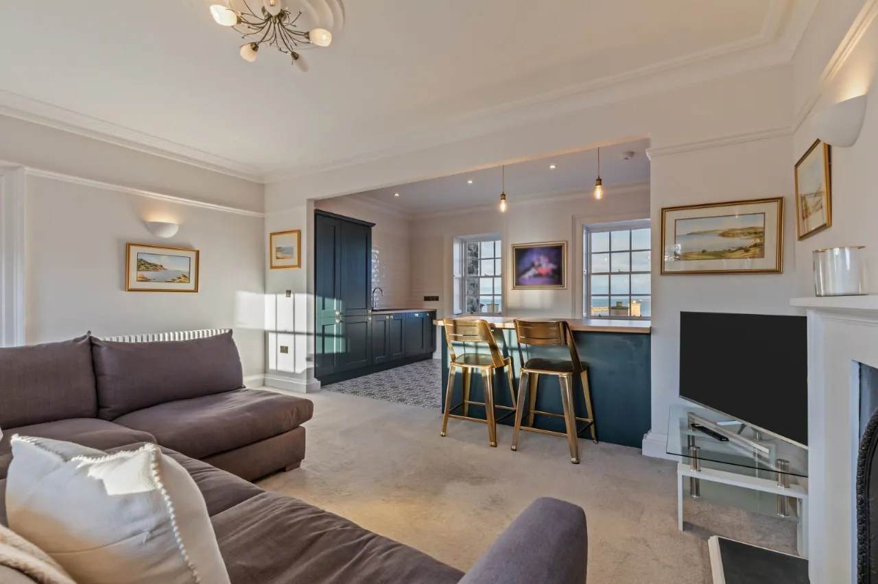 Black Rangemaster 1.5 tub single drainer sink unit with mixer taps, excellent range of high and low level dark green shaker style units, brass effect hardware, 4 ring ceramic hob unit, built in oven, stainless steel extractor hood, integrated fridge freezer, dishwasher and washer dryer, broom cupboard, concealed Worcester Bosch gas boiler, wall tiling, feature period style floor to Kitchen/Dining area, breakfast bar, dual aspect with stunning views over Donaghadee, the Lighthouse and the Irish Sea. Feature mock fireplace with slate hearth, corniced ceiling, ceiling rose, picture rail, wall light points, feature timber window surrounds, LED recessed spotlighting.
