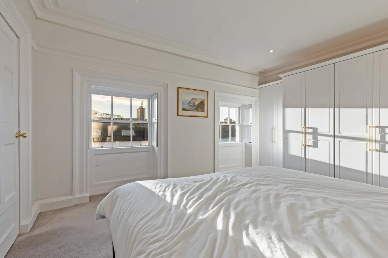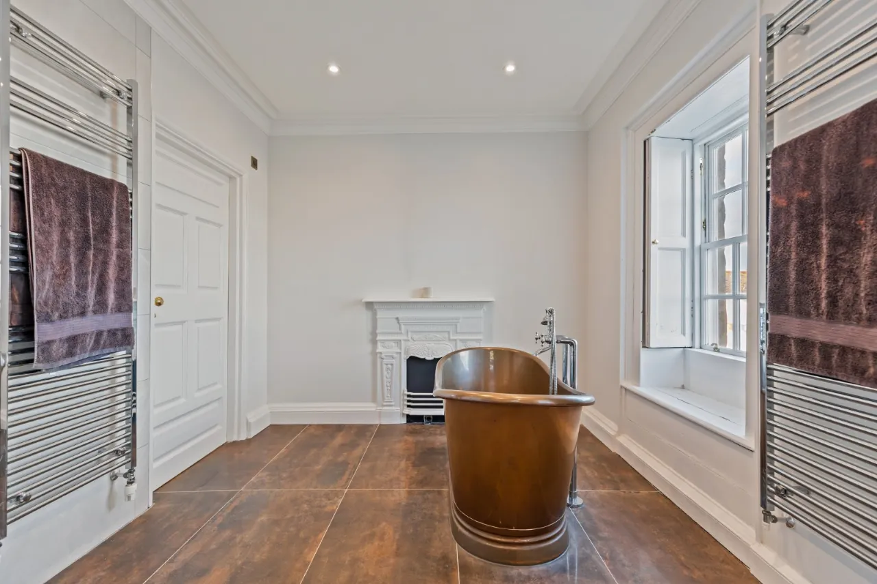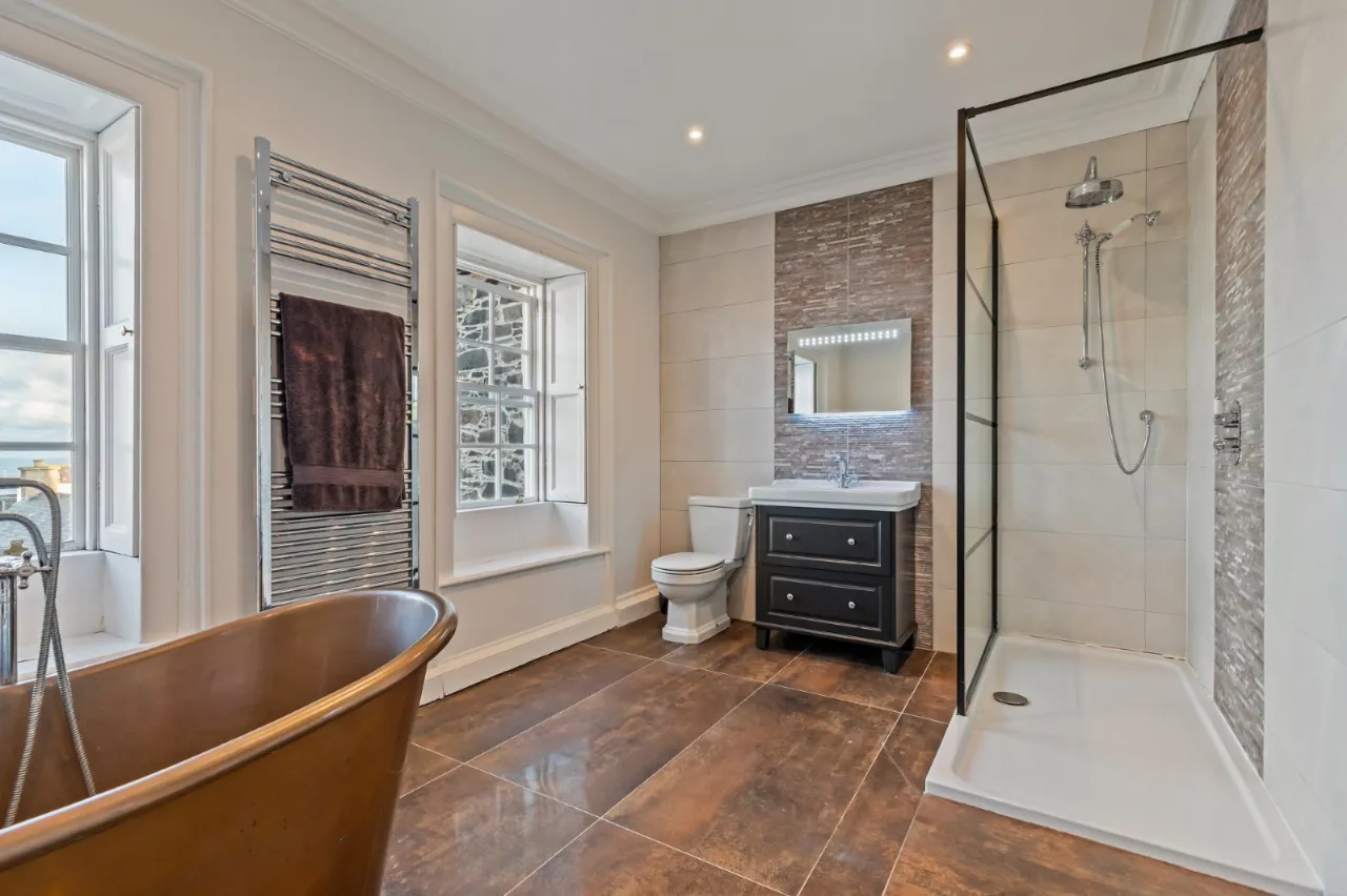 Feature freestanding copper roll top bath with mixer taps and telephone hand shower over, large wal in separate fully tiled shower cubicle with thermostatically controlled shower, rain head and telephone hand shower, glass panel, painted timber vanity floor stand, Roca wash hand basin with mixer taps, Roca low flush WC, feature wall tiling, Porcelain tiled floor, two large chrome towel radiators, mock cast iron fireplace surround, corniced ceiling, LED recessed spotlighting, extractor fan, stunning views over Donaghadee, the Lighthouse, Irish Sea, feature timber window surrounds.