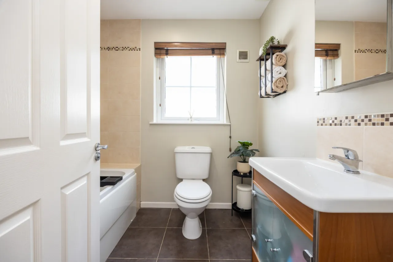 White suite comprising: Panelled bath with mixer taps and thermostatic shower, vanity sink unit with mixer taps, low flush WC, partly tiled walls, ceramic tiled floor.