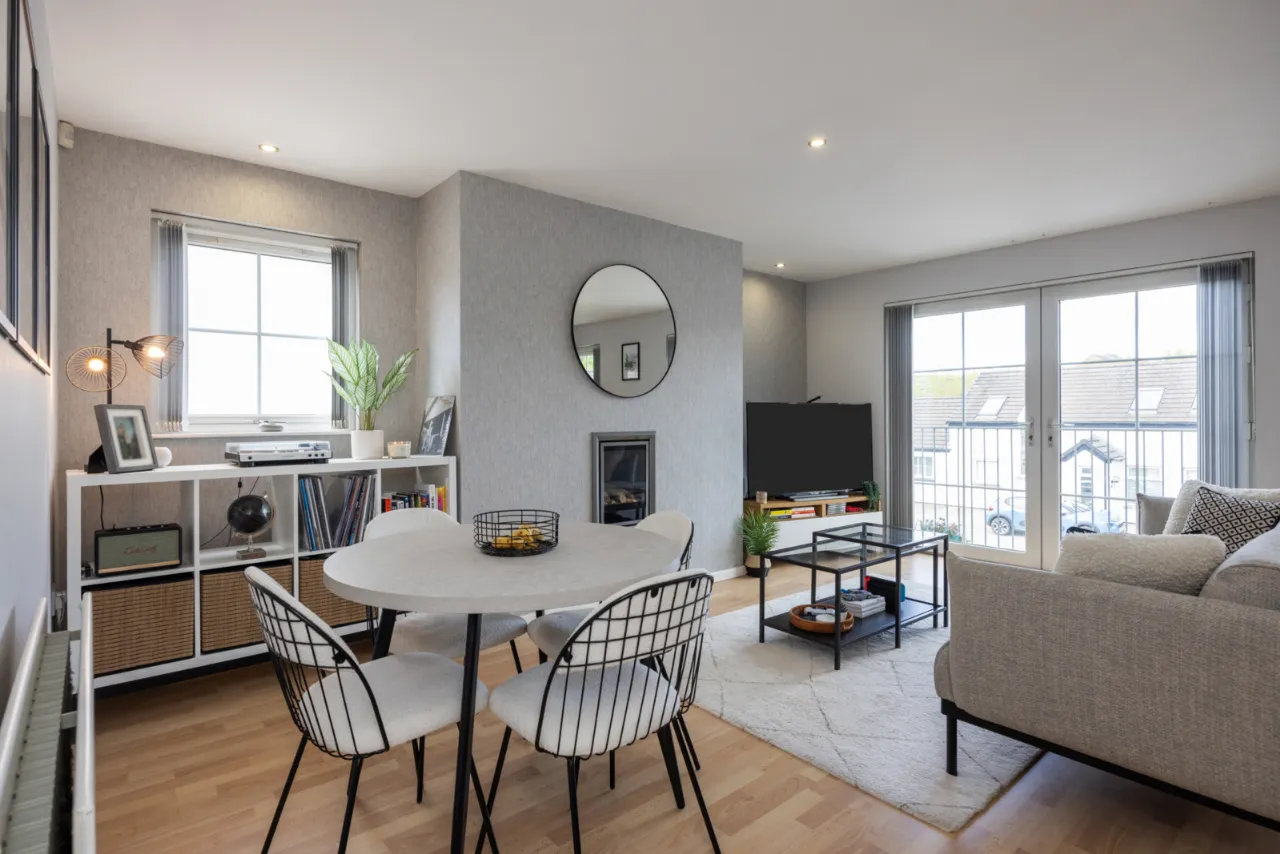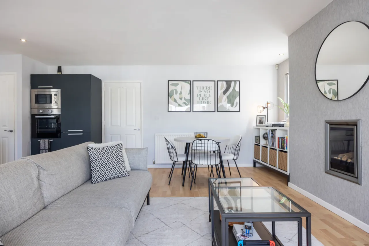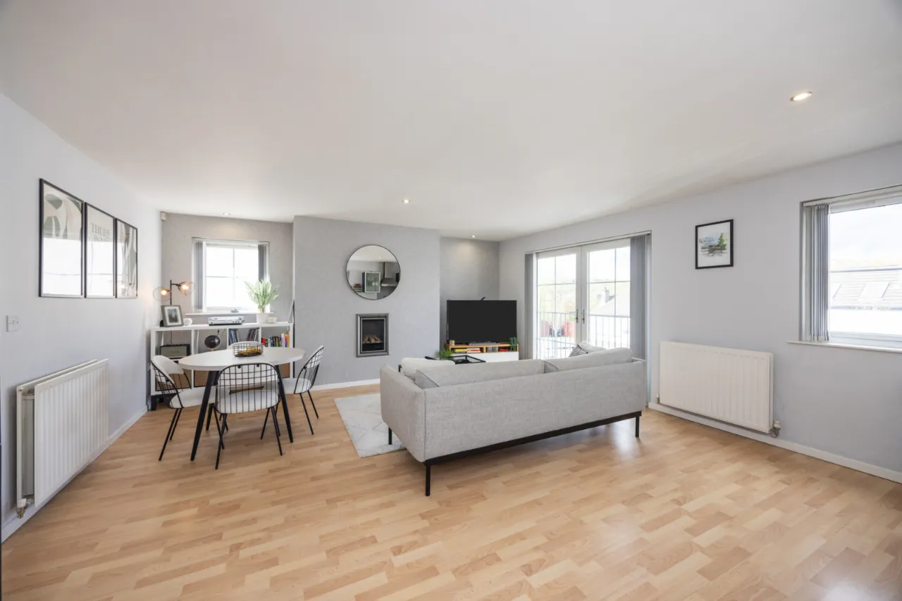 The layout comprises two generous bedrooms, a contemporary bathroom fitted with a modern white suite, and a standout open-plan living space. The spacious lounge seamlessly flows into a dining area and modern fitted kitchen, creating an ideal setting for both relaxing and entertaining.