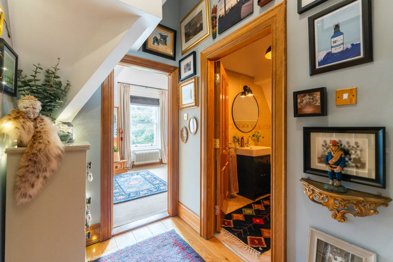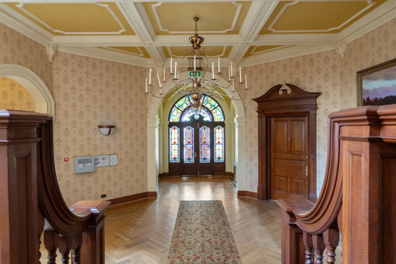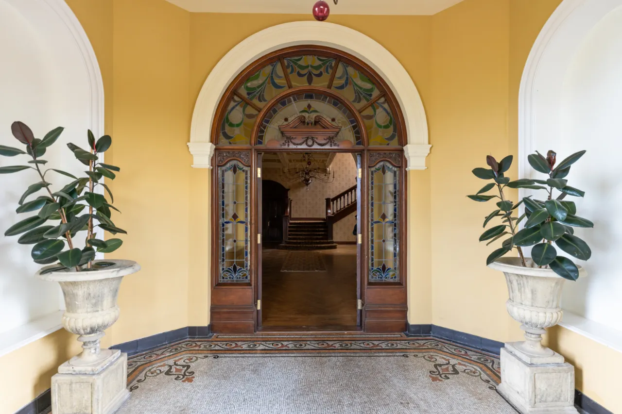 Mosaic tiled floor, stained glass door to Grand Hallway with parquet flooring. Lift or stairs to top floor. Hardwood front door to Apartment 17.