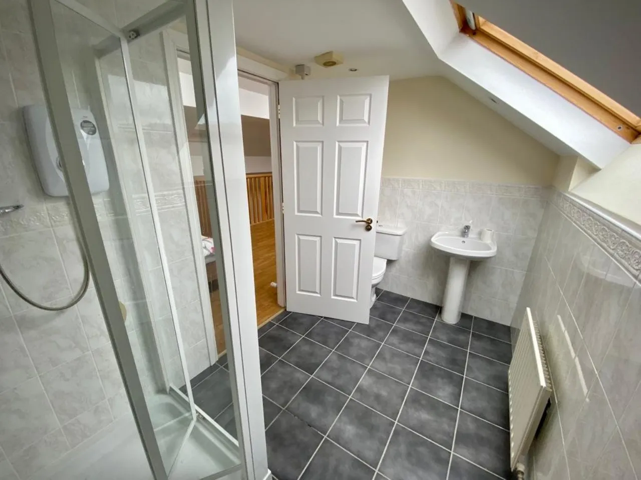 White suite comprising low flush WC, pedestal wash hand basin, shower cubicle, ceramic tiled floor, part tiled walls