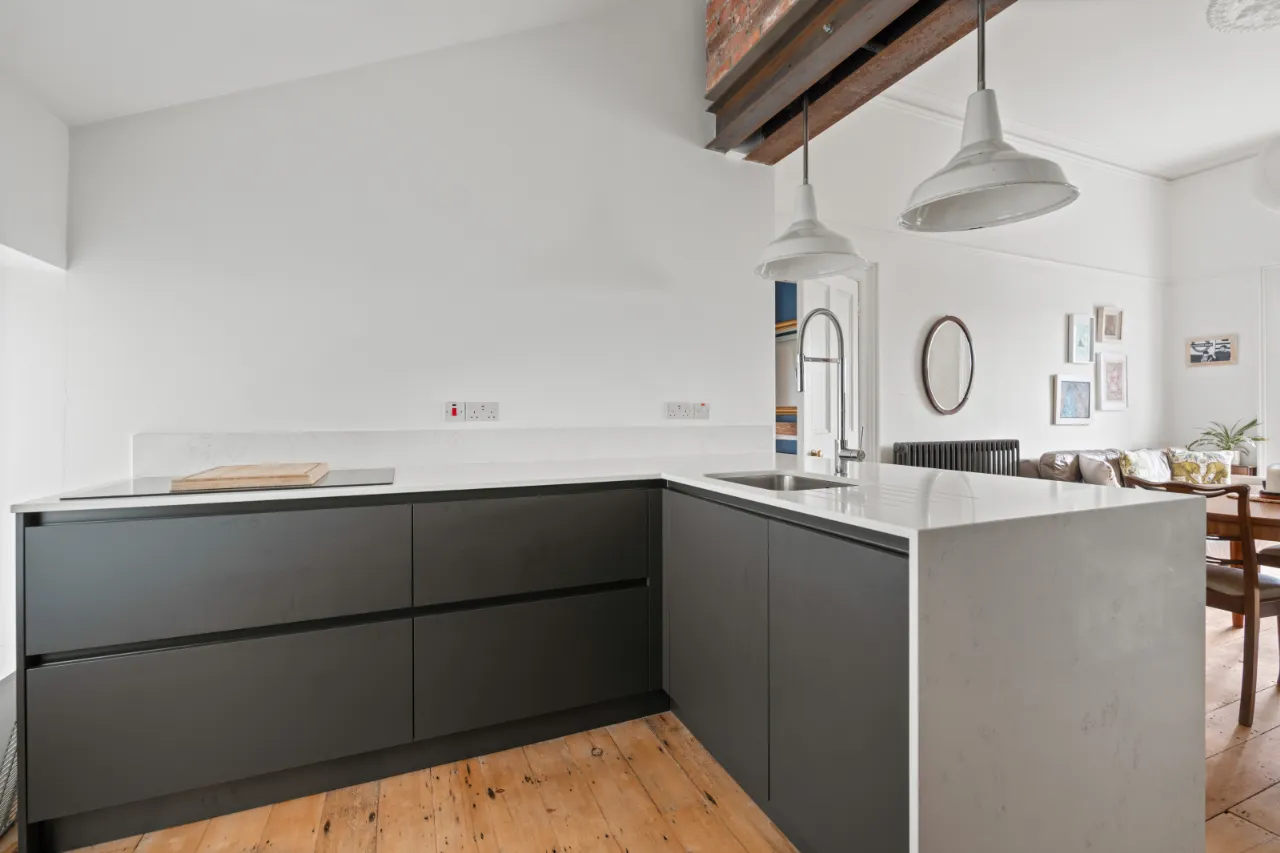 The apartment features two spacious bedrooms, a bright open plan living and dining area, and a sleek modern kitchen fitted with premium integrated appliances. Large sash windows flood the space with natural light with views of Belfast Lough from all three front facing windows. Outside, residents can enjoy parking and direct access to a shared courtyard.