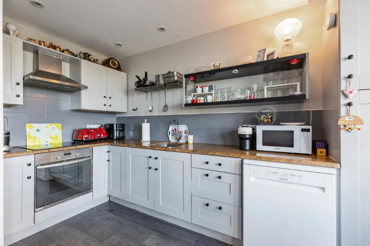 Modern fitted kitchen with excellent range of units, work surfaces, sink unit and range of integrated appliances. Feature bay window overlooking Belfast City.