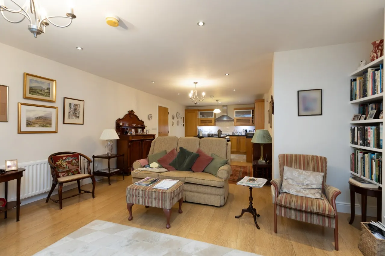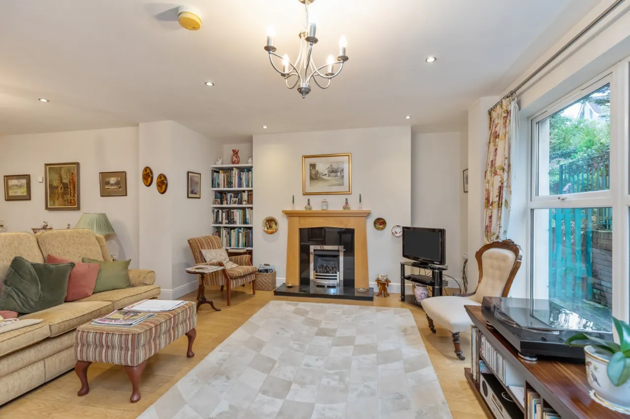 (at widest points including kitchen). Wooden fireplace with granite inset and hearth, gas coal effect fire, built-in shelving, low voltage spotlights. glazed door to south facing garden. Open plan to ...