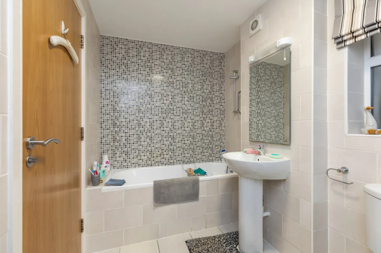 White suite comprising low flush wc, fully tiled shower cubicle with electric shower, pedestal wash hand basin, panelled bath with shower over, fully tiled walls, ceramic tiled floor, vanity unit and mirrored doors.