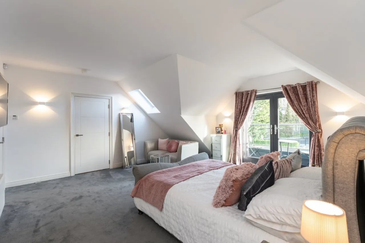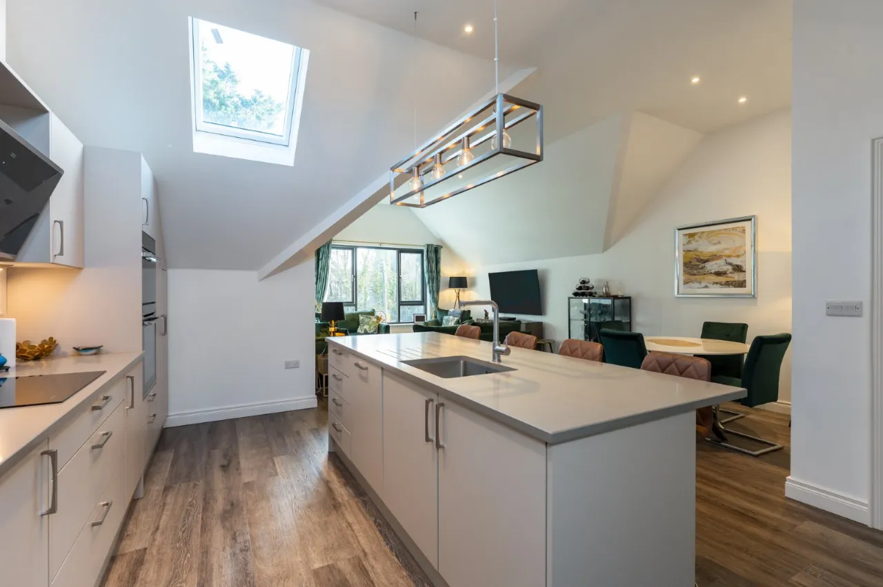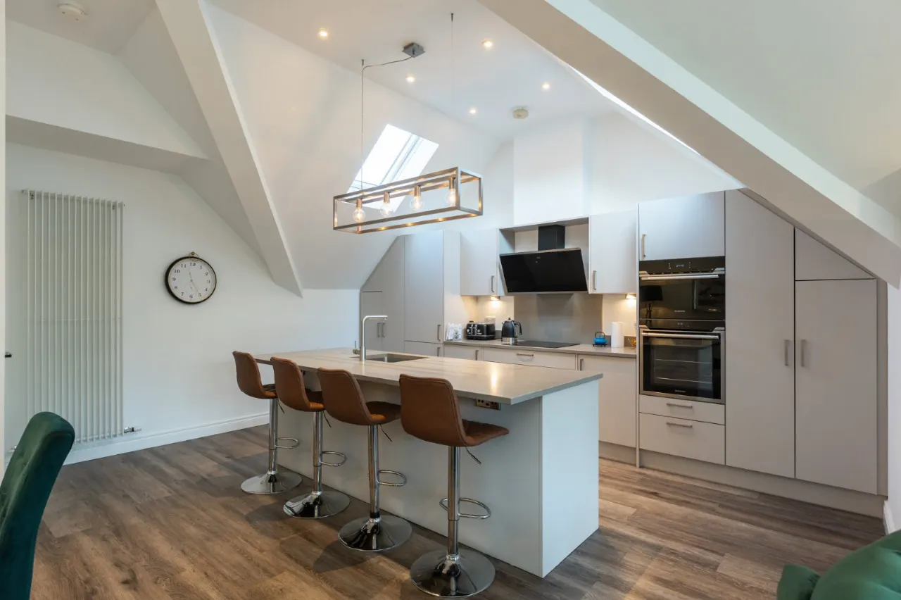 Range of high and low level units, quartz worktops, family island with inset sink, integrated fridge freezer, Worchester gas boiler, Hoover electric oven and combination microwave, Candy integrated dishwasher, 4 ring ceramic hob, Franke extractor fan, wooden floor, spotlights, velux windows