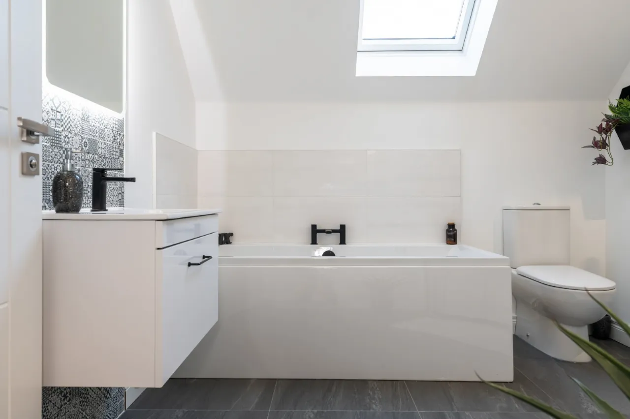 Tiled floor, low flush WC, pedestal wash hand basin with vanity unit, bath, fully tiled corner shower cubicle, radiator, extractor fan, velux window