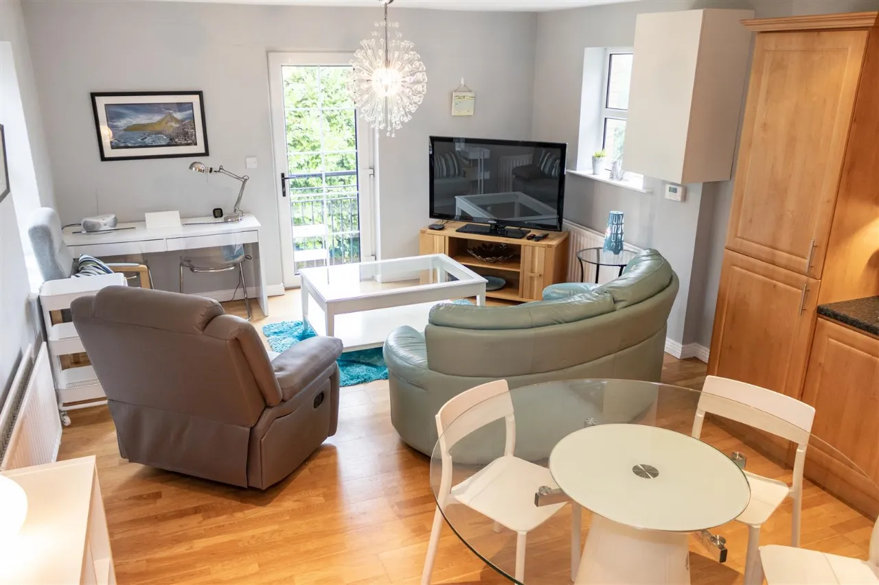 Living Area – Laminate wooden flooring continued, TV point, glazed PVC patio door opening onto 'Step-Out' balcony, views over communal gardens, side windows with beautiful views of the mountains.