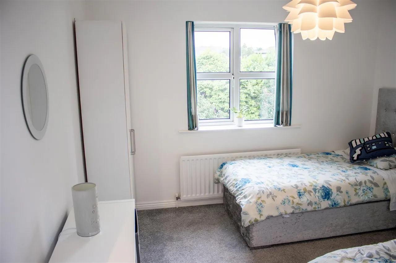 Double bedroom with carpeted flooring. Single radiator.