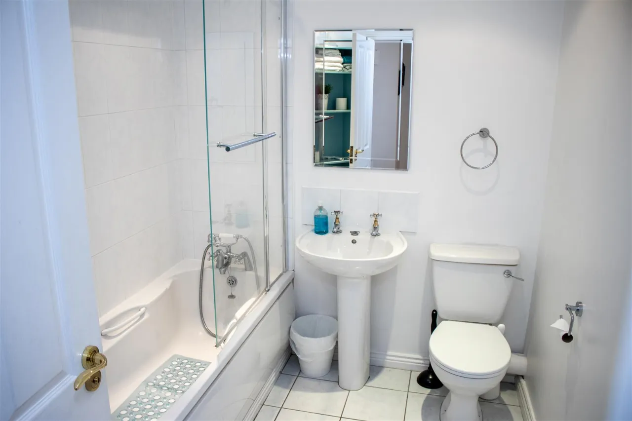 White bathroom suite comprising of low flush W.c. pedestal wash hand basin and panel bath with handheld shower fitting. Recessed spot lighting, tiled flooring, partially tiled walls and single radiator.