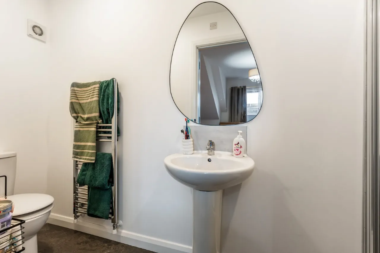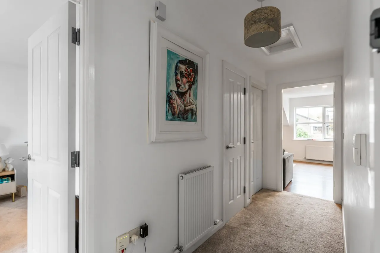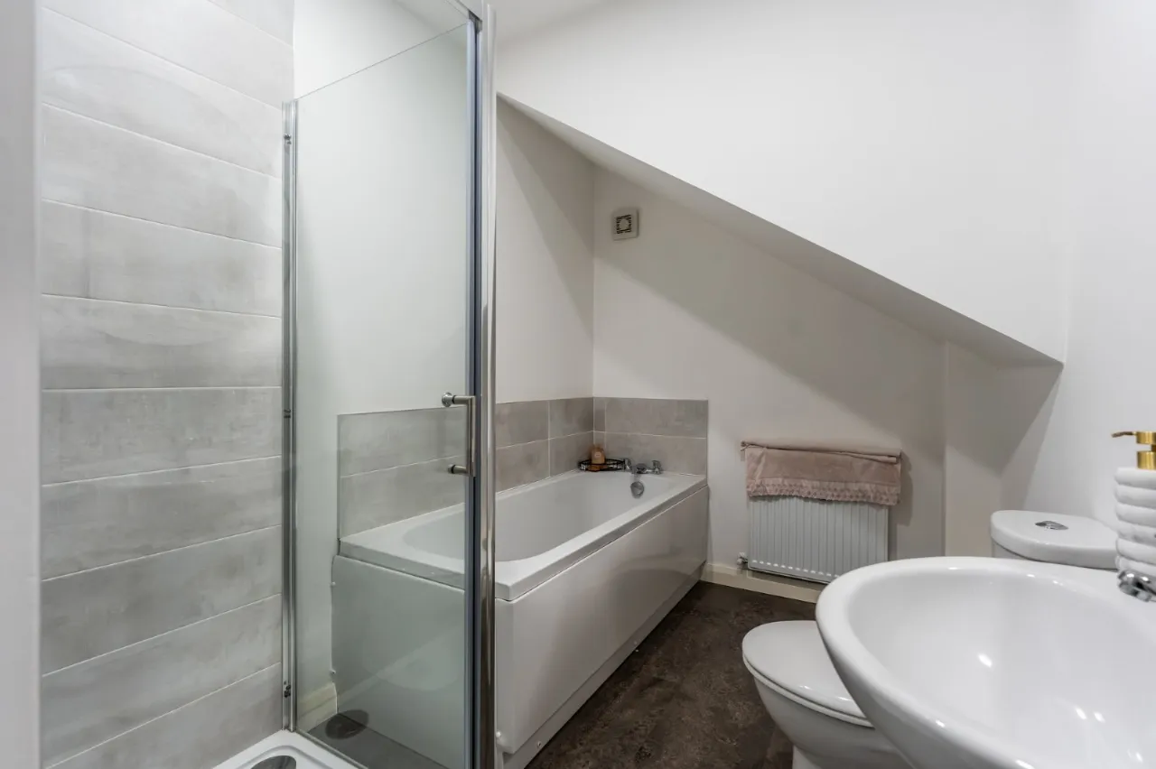 Modern white suite comprising: separate fully tiled shower cubicle with thermostatically controlled shower, pedestal wash hand basin with mixer taps, push button WC, chrome towel radiator, LED recessed spotlighting, extractor fan, polished laminate floor.