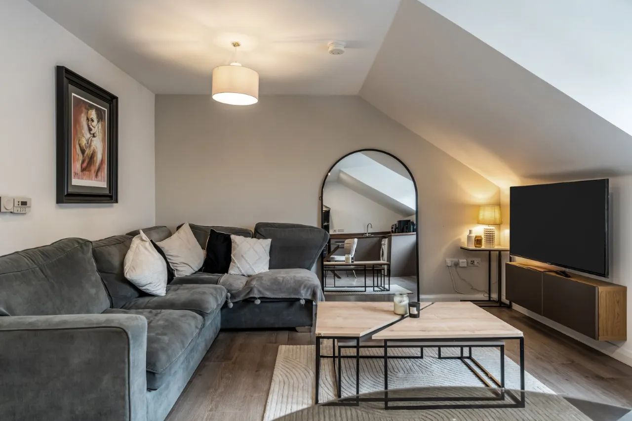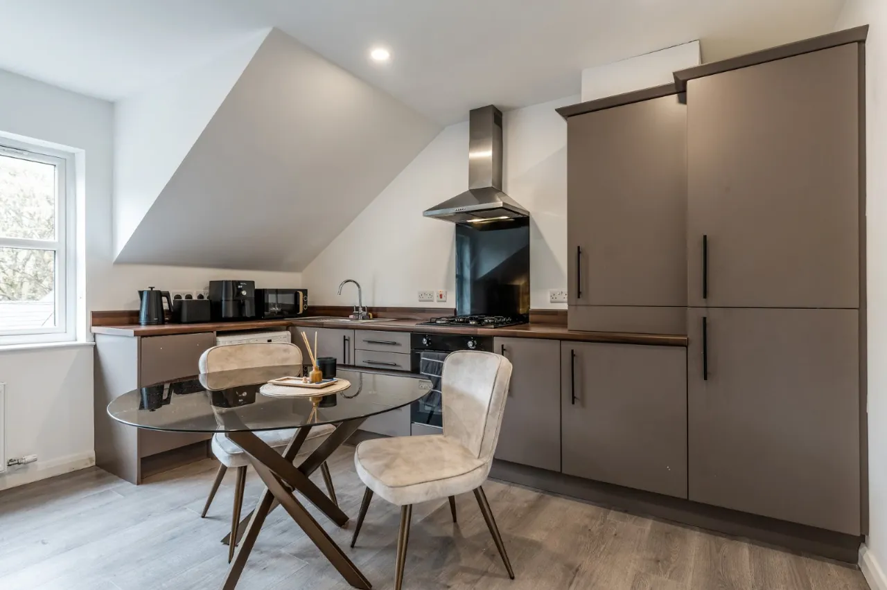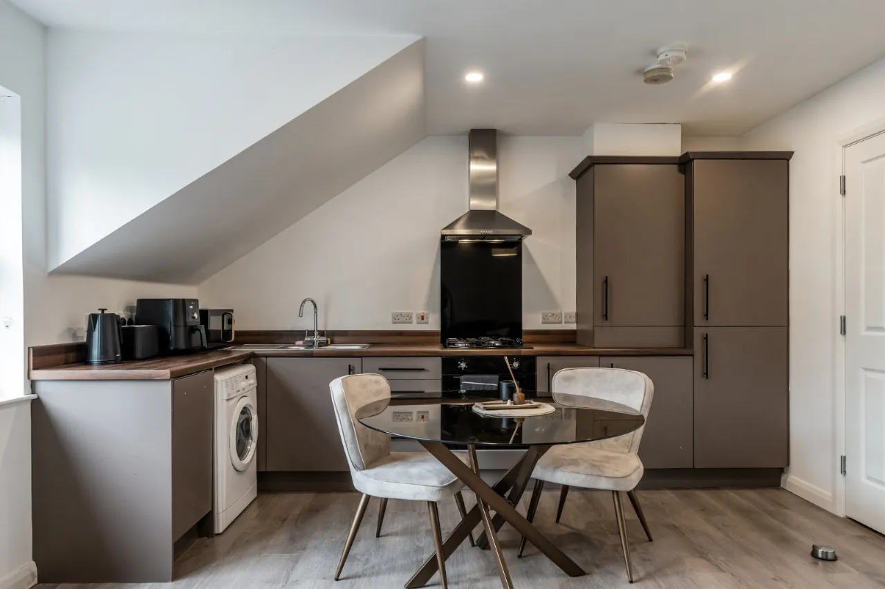 1.5 tub single drainer stainless steel sink unit with mixer taps, excellent range of hind low level Walnut coloured modern units, wood effect Formica roll edge work surfaces, 4 ring gas hob unit, built in oven, stainless steel extractor hood, black glass splashback, integrated fridge and dishwasher, plumbed for washing machine, concealed gas boiler, polished laminate floor, TV and telephone points, view over Belfast side of Newtownards, intercom handset, LED recessed spotlighting. Storage cupboard.
