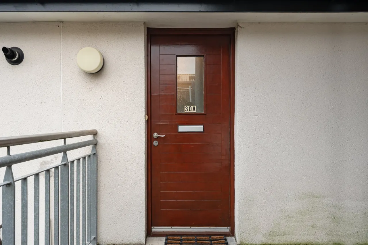 External staircase leading to First Floor Landing and solid wood front door to Apartment 30A, outside light.