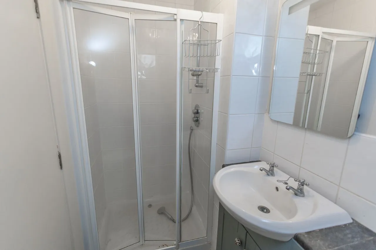 Tiled flooring. Partially tiled walls. Shower unit and thermostat shower. Sink with vanity unit. Low flush wc. Wall mounted mirror.