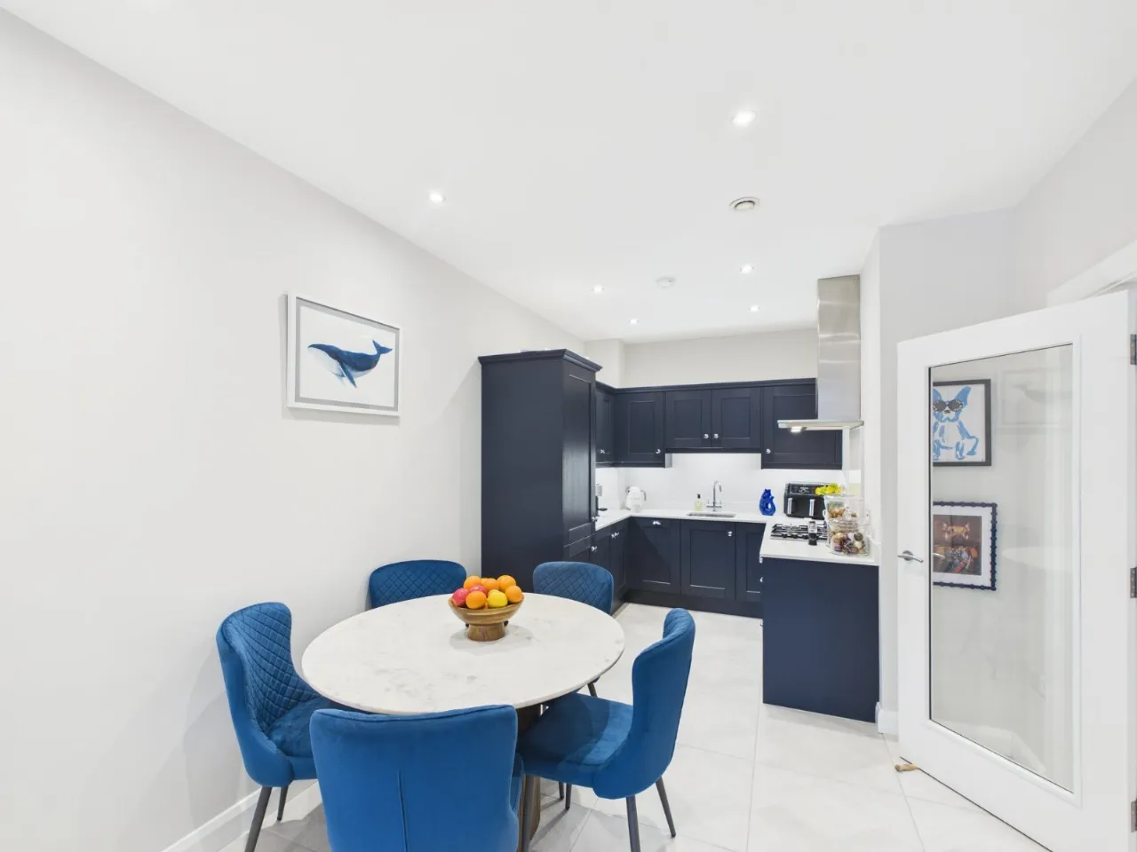 The apartment features a spacious open-plan kitchen, living and dining area, designed to maximise natural light and create a comfortable, sociable living space. The contemporary kitchen is neatly integrated, offering ample storage and a range of integrated appliances, while the living and dining areas provide flexibility for both everyday living and entertaining.