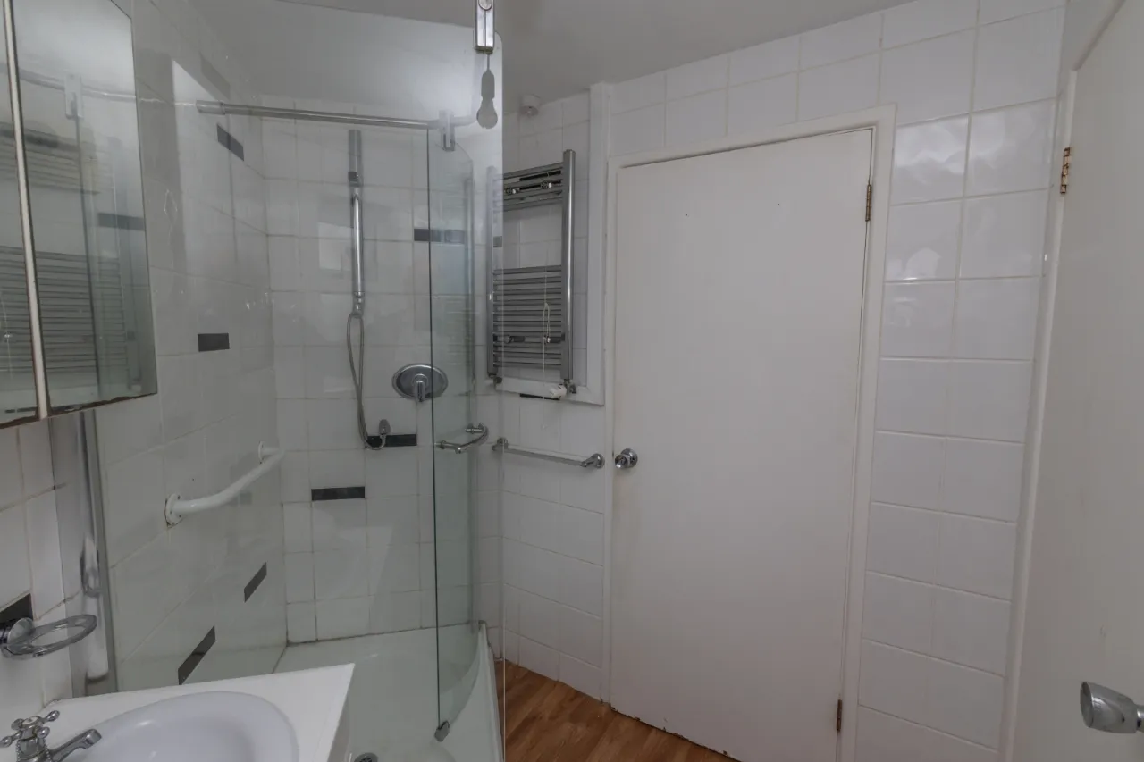 Walk-in Shower. Sink basin with cupboard underneath. W.C. Heated towel radiator. Wooden flooring. Fully tiled walls. Wall mounted mirror/unit.